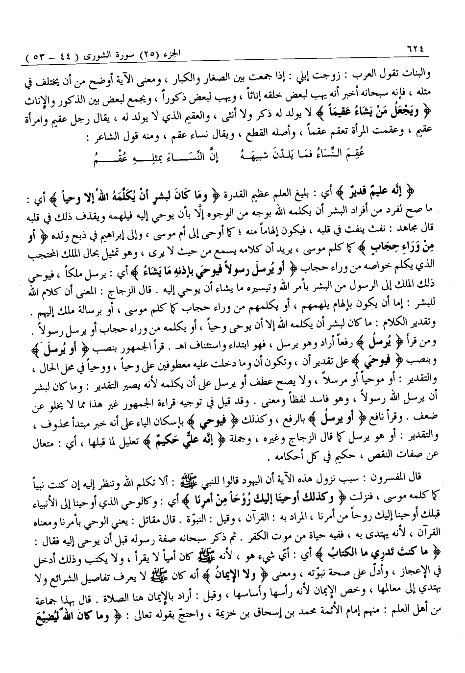 وَالْبَنَاتِ تَقُولُ الْعَرَبُ: زَوَّجْتُ إِبِلِي: إِذَا جَمَعْتَ بَيْنَ الصِّغَارِ وَالْكِبَارِ، وَمَعْنَى الْآيَةِ أَوْضَحُ مِنْ أَنْ يُخْتَلَفَ فِي مِثْلِهِ، فَإِنَّهُ سُبْحَانَهُ أَخْبَرَ أَنَّهُ يَهَبُ لِبَعْضِ خَلْقِهِ إِنَاثًا، وَيَهَبُ لِبَعْضٍ ذُكُورًا، وَيَجْمَعُ لِبَعْضٍ بَيْنَ الذُّكُورِ وَالْإِنَاثِ وَيَجْعَلُ مَنْ يَشاءُ عَقِيماً لَا يُولَدُ لَهُ ذَكَرٌ وَلَا أُنْثَى، وَالْعَقِيمُ الَّذِي لَا يُولَدُ لَهُ، يُقَالُ رَجُلٌ عَقِيمٌ وَامْرَأَةٌ عَقِيمٌ، وَعَقَمَتِ الْمَرْأَةُ تَعْقُمُ عُقْمًا، وَأَصْلُهُ الْقَطْعُ، وَيُقَالُ نِسَاءٌ عُقْمٌ، وَمِنْهُ قَوْلُ الشَّاعِرِ: