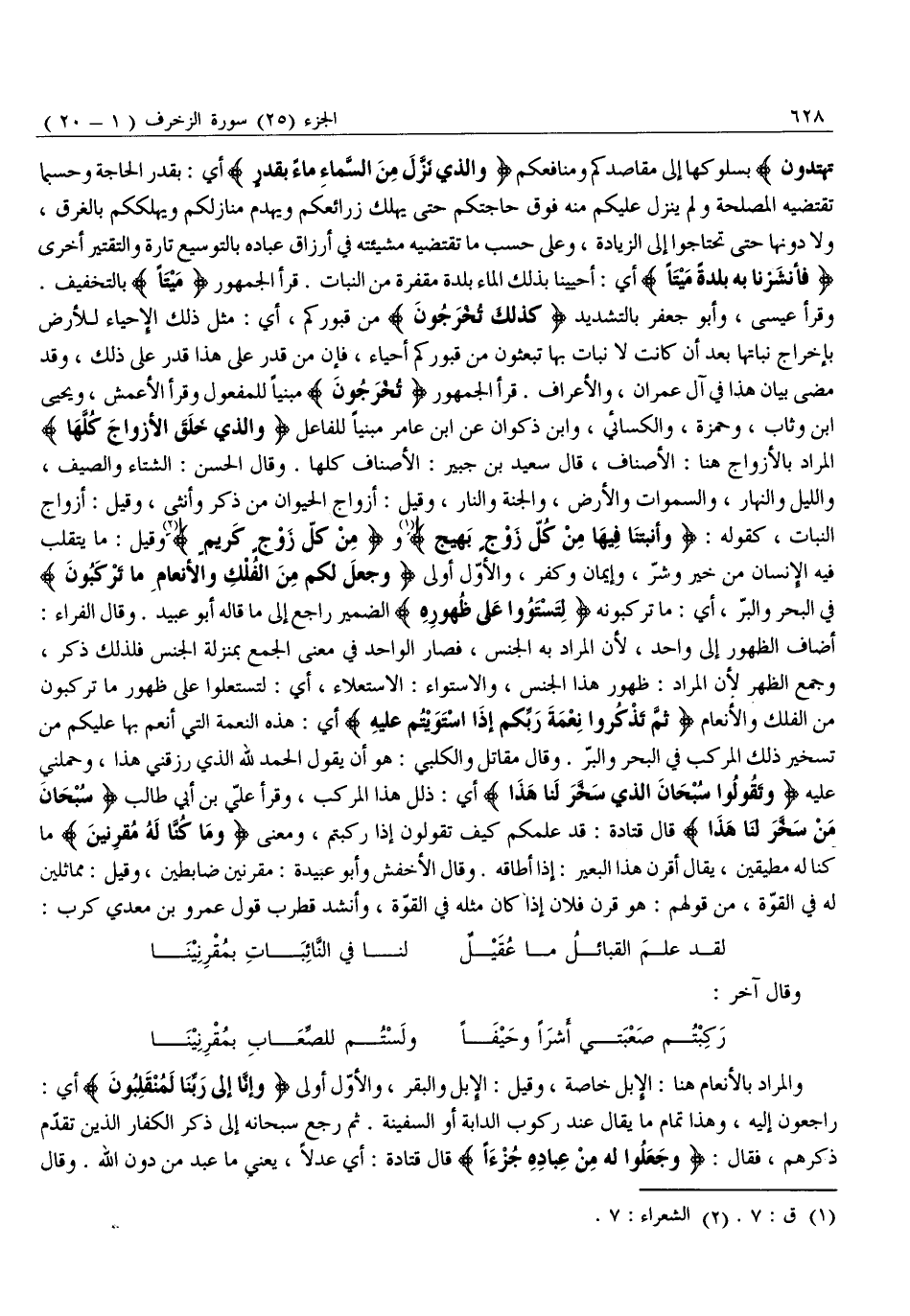 وَقَرَأَ عِيسَى، وَأَبُو جَعْفَرٍ بِالتَّشْدِيدِ كَذلِكَ تُخْرَجُونَ مِنْ قُبُورِكُمْ، أَيْ: مِثْلُ ذَلِكَ الْإِحْيَاءِ لِلْأَرْضِ بِإِخْرَاجِ نَبَاتِهَا بَعْدَ أَنْ كَانَتْ لَا نَبَاتَ بِهَا تُبْعَثُونَ مِنْ قُبُورِكُمْ أَحْيَاءً، فَإِنَّ مَنْ قَدَرَ عَلَى هَذَا قَدَرَ عَلَى ذَلِكَ، وَقَدْ مَضَى بَيَانُ هَذَا فِي آلِ عِمْرَانَ، وَالْأَعْرَافِ. قَرَأَ الْجُمْهُورُ تُخْرَجُونَ مَبْنِيًّا لِلْمَفْعُولِ وَقَرَأَ الْأَعْمَشُ، ويحيى ابن وَثَّابٍ، وَحَمْزَةُ، وَالْكِسَائِيُّ، وَابْنُ ذَكْوَانَ عَنِ ابْنِ عَامِرٍ مَبْنِيًّا لِلْفَاعِلِ وَالَّذِي خَلَقَ الْأَزْواجَ كُلَّها الْمُرَادُ بِالْأَزْوَاجِ هُنَا: الْأَصْنَافُ، قَالَ سَعِيدُ بْنُ جُبَيْرٍ: الْأَصْنَافُ كُلُّهَا. وَقَالَ الْحَسَنُ: الشِّتَاءُ وَالصَّيْفُ، والليل والنهار، والسموات وَالْأَرْضُ، وَالْجَنَّةُ وَالنَّارُ، وَقِيلَ: أَزْوَاجُ الْحَيَوَانِ مِنْ ذَكَرٍ وَأُنْثَى، وَقِيلَ: أَزْوَاجُ النَّبَاتِ، كَقَوْلِهِ: وَأَنْبَتْنا فِيها مِنْ كُلِّ زَوْجٍ بَهِيجٍ «1» ومِنْ كُلِّ زَوْجٍ كَرِيمٍ «2» وَقِيلَ: مَا يَتَقَلَّبُ فِيهِ الْإِنْسَانُ مِنْ خَيْرٍ وَشَرٍّ، وَإِيمَانٍ وَكُفْرٍ، وَالْأَوَّلُ أَوْلَى وَجَعَلَ لَكُمْ مِنَ الْفُلْكِ وَالْأَنْعامِ مَا تَرْكَبُونَ فِي الْبَحْرِ وَالْبَرِّ، أَيْ: مَا تَرْكَبُونَهُ لِتَسْتَوُوا عَلى ظُهُورِهِ الضَّمِيرُ رَاجِعٌ إِلَى مَا قَالَهُ أَبُو عُبَيْدٍ. وَقَالَ الْفَرَّاءُ: