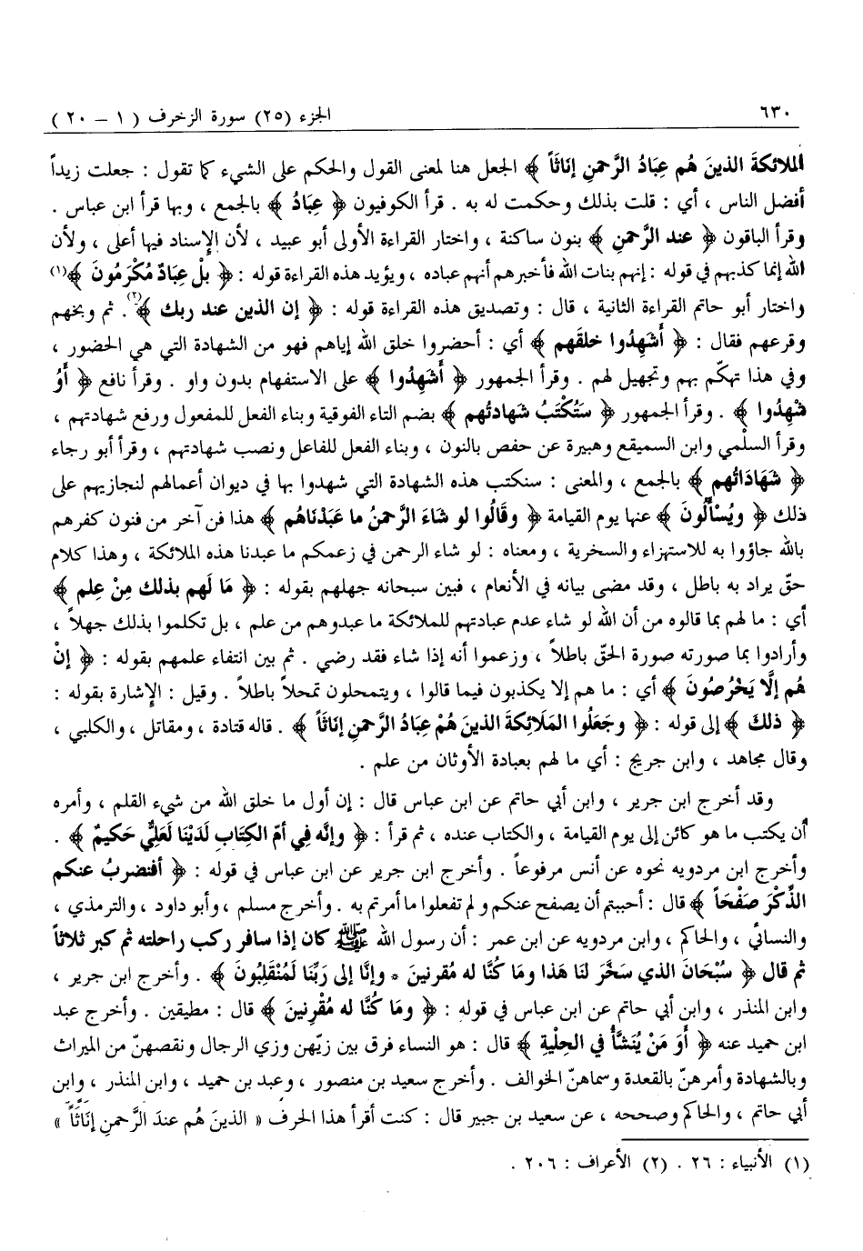 وَأَخْرَجَ ابْنُ مَرْدَوَيْهِ نَحْوَهُ عَنْ أَنَسٍ مَرْفُوعًا. وَأَخْرَجَ ابْنُ جَرِيرٍ عَنِ ابْنِ عَبَّاسٍ فِي قَوْلِهِ: أَفَنَضْرِبُ عَنْكُمُ الذِّكْرَ صَفْحاً قَالَ: أَحْبَبْتُمْ أَنْ يُصْفَحَ عَنْكُمْ وَلَمْ تَفْعَلُوا مَا أُمِرْتُمْ بِهِ. وَأَخْرَجَ مُسْلِمٌ، وَأَبُو دَاوُدَ، وَالتِّرْمِذِيُّ، وَالنَّسَائِيُّ، وَالْحَاكِمُ، وَابْنُ مَرْدَوَيْهِ عَنِ ابْنِ عُمَرَ: أَنَّ رَسُولَ اللَّهِ صَلَّى اللَّهُ عَلَيْهِ وَسَلَّمَ كَانَ إِذَا سَافَرَ رَكِبَ رَاحِلَتَهُ ثُمَّ كَبَّرَ ثَلَاثًا ثُمَّ قَالَ سُبْحانَ الَّذِي سَخَّرَ لَنا هَذَا وَما كُنَّا لَهُ مُقْرِنِينَ وَإِنَّا إِلى رَبِّنا لَمُنْقَلِبُونَ. وَأَخْرَجَ ابْنُ جَرِيرٍ، وَابْنُ الْمُنْذِرِ، وَابْنُ أَبِي حَاتِمٍ عَنِ ابْنِ عَبَّاسٍ فِي قَوْلِهِ: وَما كُنَّا لَهُ مُقْرِنِينَ قَالَ: مطيقين. وأخرج عبد ابن حميد عنه أَوَمَنْ يُنَشَّؤُا فِي الْحِلْيَةِ قَالَ: هُوَ النِّسَاءُ فَرَّقَ بَيْنَ زِيِّهِنَّ وَزِيِّ الرِّجَالِ وَنَقَصَهُنَّ مِنَ الْمِيرَاثِ وَبِالشَّهَادَةِ وَأَمَرَهُنَّ بِالْقَعْدَةِ وَسَمَّاهُنَّ الْخَوَالِفَ. وَأَخْرَجَ سَعِيدُ بْنُ مَنْصُورٍ، وَعَبْدُ بْنُ حُمَيْدٍ، وَابْنُ الْمُنْذِرِ، وَابْنُ أَبِي حَاتِمٍ، وَالْحَاكِمُ وَصَحَّحَهُ، عَنْ سَعِيدِ بْنِ جُبَيْرٍ قَالَ: كُنْتُ أَقْرَأُ هَذَا الْحَرْفَ «الَّذِينَ هم عند الرّحمن إناثا»