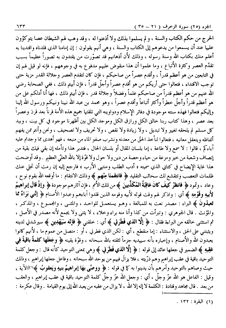 الْحَرَجِ مِنْ حُكْمِ الْكِتَابِ وَالسُّنَّةِ، وَلَمْ يُسَلِّمُوا بذلك وَلَا أَذْعَنُوا لَهُ، وَقَدْ وَهَبَ لَهُمُ الشَّيْطَانُ عصا يتوكؤون عَلَيْهَا عِنْدَ أَنْ يَسْمَعُوا مَنْ يَدْعُوهُمْ إِلَى الْكِتَابِ وَالسُّنَّةِ، وَهِيَ أَنَّهُمْ يَقُولُونَ: إِنَّ إِمَامَنَا الَّذِي قَلَّدْنَاهُ وَاقْتَدَيْنَا بِهِ أَعْلَمُ مِنْكَ بِكِتَابِ اللَّهِ وَسُنَّةِ رَسُولِهِ، وَذَلِكَ لِأَنَّ أَذْهَانَهُمْ قَدْ تَصَوَّرَتْ مَنْ يَقْتَدُونَ بِهِ تَصَوُّرًا عَظِيمًا بِسَبَبِ تَقَدُّمِ الْعَصْرِ وَكَثْرَةِ الْأَتْبَاعِ، وَمَا عَلِمُوا أَنَّ هَذَا مَنْقُوضٌ عَلَيْهِمْ مَدْفُوعٌ بِهِ فِي وُجُوهِهِمْ، فَإِنَّهُ لَوْ قِيلَ لَهُمْ إِنَّ فِي التَّابِعِينَ مَنْ هُوَ أَعْظَمُ قَدْرًا، وَأَقْدَمُ عَصْرًا مِنْ صَاحِبِكُمْ، فَإِنْ كَانَ لِتَقَدُّمِ الْعَصْرِ وَجَلَالَةِ الْقَدْرِ مَزِيَّةٌ حَتَّى تُوجِبَ الِاقْتِدَاءَ، فَتَعَالَوْا حَتَّى أُرِيَكُمْ مَنْ هُوَ أَقْدَمُ عَصْرًا وَأَجَلُّ قَدْرًا، فَإِنْ أبيتم ذلك، ففي الصحابة رضي الله عنهم من هو أعظم قدرا من صاحبكم علما وفضلا وجلالة قدر، فَإِنْ أَبَيْتُمْ ذَلِكَ، فَهَا أَنَا أَدُلُّكُمْ عَلَى مَنْ هُوَ أَعْظَمُ قَدْرًا وَأَجَلُّ خَطَرًا وَأَكْثَرُ أَتْبَاعًا وَأَقْدَمُ عَصْرًا، وَهُوَ مُحَمَّدُ بْنُ عَبْدِ الله نبينا ونبيكم ورسول اللَّهِ إِلَيْنَا وَإِلَيْكُمْ فَتَعَالَوْا فَهَذِهِ سُنَّتُهُ مَوْجُودَةٌ فِي دَفَاتِرِ الْإِسْلَامِ وَدَوَاوِينِهِ الَّتِي تَلَقَّتْهَا جَمِيعُ هَذِهِ الْأُمَّةِ قَرْنًا بَعْدَ قَرْنٍ وَعَصْرًا بَعْدَ عَصْرٍ، وَهَذَا كِتَابُ رَبِّنَا خَالِقِ الْكُلِّ وَرَازِقِ الْكُلِّ وَمُوجِدِ الْكُلِّ بَيْنَ أَظْهُرِنَا مَوْجُودٌ فِي كُلِّ بَيْتٍ، وَبِيَدِ كُلِّ مُسْلِمٍ لَمْ يَلْحَقْهُ تَغْيِيرٌ وَلَا تَبْدِيلٌ، وَلَا زِيَادَةٌ وَلَا نَقْصٌ، وَلَا تَحْرِيفٌ وَلَا تَصْحِيفٌ، وَنَحْنُ وَأَنْتُمْ مِمَّنْ يَفْهَمُ أَلْفَاظَهُ وَيَتَعَقَّلُ مَعَانِيَهُ، فَتَعَالَوْا لِنَأْخُذِ الْحَقَّ مِنْ مَعْدِنِهِ وَنَشْرَبَ صَفْوَ الْمَاءِ مِنْ مَنْبَعِهِ، فَهُوَ أَهْدَى مِمَّا وَجَدْتُمْ عَلَيْهِ آبَاءَكُمْ، قَالُوا: لَا سَمْعَ وَلَا طَاعَةَ، إِمَّا بِلِسَانِ الْمَقَالِ أَوْ بِلِسَانِ الْحَالِ، فَتَدَبَّرْ هَذَا وَتَأَمَّلْهُ إِنْ بَقِيَ فِيكَ بَقِيَّةٌ مِنْ إِنْصَافٍ وَشُعْبَةٌ مِنْ خَيْرٍ وَمِزْعَةٌ مِنْ حَيَاءٍ وَحِصَّةٌ مِنْ دِينٍ وَلَا حَوْلَ وَلَا قُوَّةَ إِلَّا بِاللَّهِ الْعَلِيِّ الْعَظِيمِ. وَقَدْ أَوْضَحْتُ هَذَا غَايَةَ الْإِيضَاحِ فِي كِتَابِي الَّذِي سَمَّيْتُهُ «أَدَبَ الطَّلَبِ وَمُنْتَهَى الْأَرَبِ» فارجع إليه إن رمت أن تجلي عنك ظلمات التعصب وتتقشع لَكَ سَحَائِبُ التَّقْلِيدِ فَانْتَقَمْنا مِنْهُمْ وَذَلِكَ الِانْتِقَامُ: مَا أَوْقَعَهُ اللَّهُ بِقَوْمِ نُوحٍ، وَعَادٍ، وَثَمُودَ فَانْظُرْ كَيْفَ كانَ عاقِبَةُ الْمُكَذِّبِينَ مِنْ تِلْكَ الْأُمَمِ، فَإِنَّ آثَارَهُمْ مَوْجُودَةٌ وَإِذْ قالَ إِبْراهِيمُ لِأَبِيهِ وَقَوْمِهِ أَيْ: وَاذْكُرْ لَهُمْ وَقْتَ قَوْلِهِ لِأَبِيهِ وَقَوْمِهِ الَّذِينَ قَلَّدُوا آبَاءَهُمْ وَعَبَدُوا الْأَصْنَامَ إِنَّنِي بَراءٌ مِمَّا تَعْبُدُونَ الْبَرَاءُ: مَصْدَرٌ نُعِتَ بِهِ لِلْمُبَالَغَةِ، وَهُوَ يُسْتَعْمَلُ لِلْوَاحِدِ، وَالْمُثَنَّى، وَالْمَجْمُوعِ، وَالْمُذَكَّرِ، وَالْمُؤَنَّثِ. قَالَ الْجَوْهَرِيُّ: وَتَبَرَّأْتُ مِنْ كَذَا وَأَنَا مِنْهُ بَرَاءٌ وَخَلَاءٌ، لَا يُثَنَّى وَلَا يُجْمَعُ لِأَنَّهُ مَصْدَرٌ فِي الْأَصْلِ، ثُمَّ اسْتَثْنَى خَالِقَهُ مِنَ الْبَرَاءَةِ فَقَالَ: إِلَّا الَّذِي فَطَرَنِي أَيْ: خَلَقَنِي فَإِنَّهُ سَيَهْدِينِ سَيُرْشِدُنِي لِدِينِهِ وَيُثَ