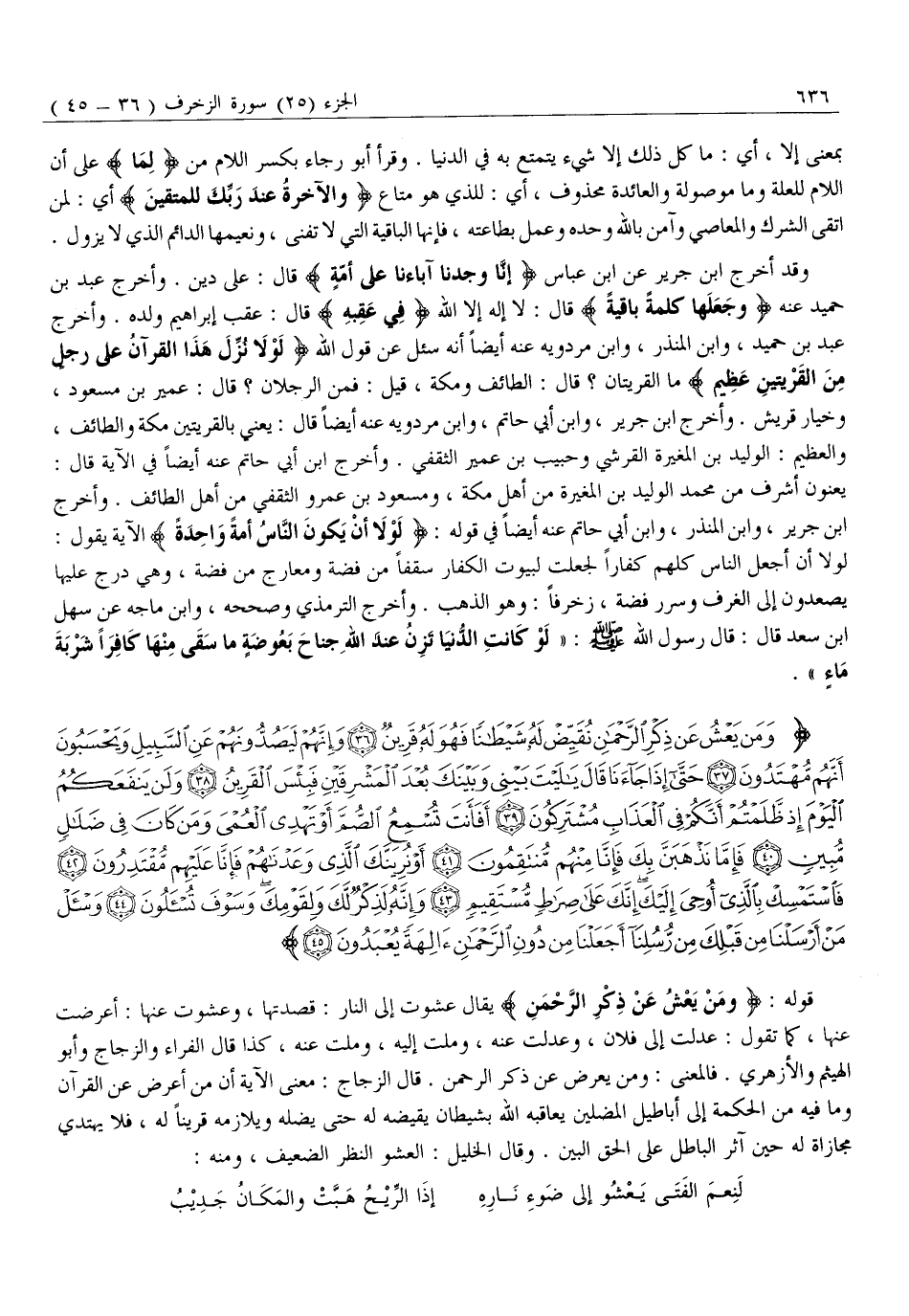 وَقَدْ أَخْرَجَ ابْنُ جَرِيرٍ عَنِ ابْنِ عَبَّاسٍ إِنَّا وَجَدْنا آباءَنا عَلى أُمَّةٍ قَالَ: عَلَى دِينٍ. وَأَخْرَجَ عَبْدُ بْنُ حُمَيْدٍ عَنْهُ وَجَعَلَها كَلِمَةً باقِيَةً قَالَ: لَا إِلَهَ إِلَّا اللَّهُ فِي عَقِبِهِ قَالَ: عَقِبُ إِبْرَاهِيمَ وَلَدُهُ. وَأَخْرَجَ عَبْدُ بْنُ حُمَيْدٍ، وَابْنُ الْمُنْذِرِ، وَابْنُ مَرْدَوَيْهِ عَنْهُ أَيْضًا أَنَّهُ سُئِلَ عَنْ قَوْلِ اللَّهِ لَوْلا نُزِّلَ هذَا الْقُرْآنُ عَلى رَجُلٍ مِنَ الْقَرْيَتَيْنِ عَظِيمٍ مَا الْقَرْيَتَانِ؟ قَالَ: الطَّائِفُ وَمَكَّةُ، قِيلَ: فَمَنِ الرَّجُلَانِ؟ قَالَ: عُمَيْرُ بْنُ مَسْعُودٍ، وَخِيَارُ قُرَيْشٍ. وَأَخْرَجَ ابْنُ جَرِيرٍ، وَابْنُ أَبِي حَاتِمٍ، وَابْنُ مَرْدَوَيْهِ عَنْهُ أَيْضًا قَالَ: يَعْنِي بِالْقَرْيَتَيْنِ مَكَّةَ وَالطَّائِفَ، وَالْعَظِيمُ: الْوَلِيدُ بْنُ الْمُغِيرَةِ الْقُرَشِيُّ وَحَبِيبُ بْنُ عُمَيْرٍ الثَّقَفِيُّ. وَأَخْرَجَ ابْنُ أَبِي حَاتِمٍ عَنْهُ أَيْضًا فِي الْآيَةِ قال: