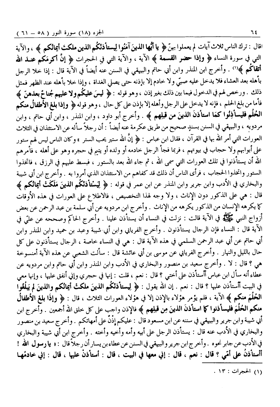 وَإِنِّي أُنْفِقُ عَلَيْهَا، وَإِنَّهَا مَعِي فِي الْبَيْتِ أَأَسْتَأْذِنُ عَلَيْهَا؟ قَالَ: نَعَمْ. إِنَّ اللَّهَ يَقُولُ: لِيَسْتَأْذِنْكُمُ الَّذِينَ مَلَكَتْ أَيْمانُكُمْ وَالَّذِينَ لَمْ يَبْلُغُوا الْحُلُمَ مِنْكُمْ الْآيَةَ، فَلَمْ يُؤْمَرْ هَؤُلَاءِ بِالْإِذْنِ إِلَّا فِي هَؤُلَاءِ الْعَوْرَاتِ الثَّلَاثِ، قَالَ: وَإِذا بَلَغَ الْأَطْفالُ مِنْكُمُ الْحُلُمَ فَلْيَسْتَأْذِنُوا كَمَا اسْتَأْذَنَ الَّذِينَ مِنْ قَبْلِهِمْ فَالْإِذْنُ وَاجِبٌ عَلَى كُلِّ خَلْقِ اللَّهِ أَجْمَعِينَ. وَأَخْرَجَ ابْنُ أَبِي شَيْبَةَ وَابْنُ جَرِيرٍ وَالْبَيْهَقِيُّ فِي سُنَنِهِ عَنِ ابْنِ مَسْعُودٍ قَالَ: عَلَيْكُمْ إِذْنٌ عَلَى أُمَّهَاتِكُمْ. وَأَخْرَجَ سَعِيدُ بْنُ مَنْصُورٍ وَالْبُخَارِيُّ فِي الْأَدَبِ عَنْهُ قَالَ: يَسْتَأْذِنُ الرَّجُلُ عَلَى أَبِيهِ وَأُمِّهِ وَأَخِيهِ وَأُخْتِهِ. وَأَخْرَجَ ابْنُ أَبِي شَيْبَةَ وَالْبُخَارِيُّ فِي الْأَدَبِ عَنْ جَابِرٍ نَحْوَهُ. وَأَخْرَجَ ابْنُ جَرِيرٍ وَالْبَيْهَقِيُّ فِي السُّنَنِ عَنْ عَطَاءِ بْنِ يَسَارٍ أَنْ رَجُلًا قَالَ: «يَا رَسُولَ اللَّهِ! أَأَسْتَأْذِنُ عَلَى أُمِّي؟ قَالَ: نَعَمْ، قَالَ: إِنِّي مَعَهَا فِي الْبَيْتِ، قَالَ: أستأذن عليها، قال: إني خادمها