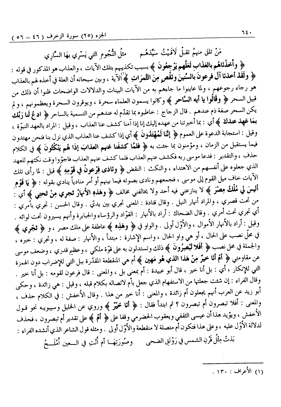 وَقِيلَ: أَرَادَ بِالْأَنْهَارِ الْأَمْوَالَ، وَالْأَوَّلُ أَوْلَى. وَالْوَاوُ فِي وَهذِهِ عاطفة على ملك مصر، وتَجْرِي فِي مَحَلِّ نَصْبٍ عَلَى الْحَالِ، أَوْ هِيَ وَاوُ الْحَالِ، وَاسْمُ الْإِشَارَةِ: مُبْتَدَأٌ، وَالْأَنْهَارُ: صِفَةٌ لَهُ، وَتَجْرِي: خَبَرُهُ، وَالْجُمْلَةُ فِي مَحَلِّ نَصْبٍ أَفَلا تُبْصِرُونَ ذَلِكَ وَتَسْتَدِلُّونَ بِهِ عَلَى قُوَّةِ مُلْكِي، وَعَظِيمِ قَدْرِي، وَضَعْفِ مُوسَى عَنْ مُقَاوَمَتِي أَمْ أَنَا خَيْرٌ مِنْ هذَا الَّذِي هُوَ مَهِينٌ أَمْ هِيَ الْمُنْقَطِعَةُ الْمُقَدَّرَةُ بِبَلِ الَّتِي للإضراب دُونَ الْهَمْزَةِ الَّتِي لِلْإِنْكَارِ، أَيْ: بَلْ أَنَا خَيْرٌ، قَالَ أَبُو عُبَيْدَةَ: أَمْ بِمَعْنَى بَلْ، وَالْمَعْنَى: قَالَ فِرْعَوْنُ لِقَوْمِهِ: بَلْ أَنَا خَيْرٌ.