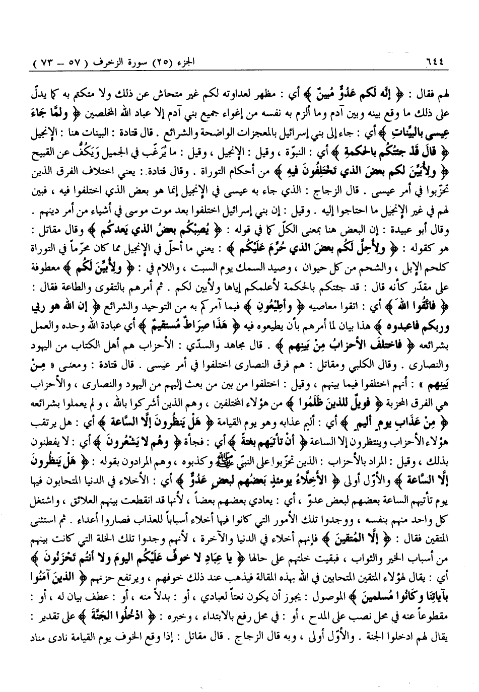 فَاتَّقُوا اللَّهَ أَيِ: اتَّقُوا مَعَاصِيَهُ وَأَطِيعُونِ فِيمَا آمُرُكُمْ بِهِ مِنَ التَّوْحِيدِ وَالشَّرَائِعِ إِنَّ اللَّهَ هُوَ رَبِّي وَرَبُّكُمْ فَاعْبُدُوهُ هَذَا بَيَانٌ لِمَا أَمَرَهُمْ بِأَنْ يُطِيعُوهُ فِيهِ هَذَا صِراطٌ مُسْتَقِيمٌ أَيْ عِبَادَةُ اللَّهِ وَحْدَهُ وَالْعَمَلُ بِشَرَائِعِهِ فَاخْتَلَفَ الْأَحْزابُ مِنْ بَيْنِهِمْ. قَالَ مُجَاهِدٌ وَالسُّدِّيُّ: الْأَحْزَابُ هُمْ أَهْلُ الْكِتَابِ مِنَ الْيَهُودِ وَالنَّصَارَى. وَقَالَ الْكَلْبِيُّ وَمُقَاتِلٌ: هُمْ فِرَقُ النَّصَارَى اخْتَلَفُوا فِي أَمْرِ عِيسَى. قَالَ قَتَادَةُ: وَمَعْنَى «مِنْ بَيْنِهِمْ» : أَنَّهُمُ اخْتَلَفُوا فِيمَا بَيْنَهُمْ، وَقِيلَ: اخْتَلَفُوا مِنْ بَيْنِ مَنْ بُعِثَ إِلَيْهِمْ مِنَ الْيَهُودِ وَالنَّصَارَى، وَالْأَحْزَابُ هي الفرق المحزبة فَوَيْلٌ لِلَّذِينَ ظَلَمُوا من هؤلاء المختلفين، وَهُمُ الَّذِينَ أَشْرَكُوا بِاللَّهِ، وَلَمْ يَعْمَلُوا بِشَرَائِعِهِ مِنْ عَذابِ يَوْمٍ أَلِيمٍ أَيْ: أَلِيمٌ عَذَابُهُ وَهُوَ يَوْمُ الْقِيَامَةِ هَلْ يَنْظُرُونَ إِلَّا السَّاعَةَ أَيْ: هَلْ يَرْتَقِبُ هَؤُلَاءِ الْأَحْزَابُ وَيَنْتَظِرُونَ إِلَّا السَّاعَةَ أَنْ تَأْتِيَهُمْ بَغْتَةً أَيْ: فَجْأَةً وَهُمْ لَا يَشْعُرُونَ أَيْ: لَا يَفْطَنُونَ بِذَلِكَ، وَقِيلَ: الْمُرَادُ بِالْأَحْزَابِ: الَّذِينَ تَحَزَّبُوا عَلَى النَّبِيِّ صَلَّى الله عليه وَسَلَّمَ وَكَذَّبُوهُ، وَهُمُ الْمُرَادُونَ بِقَوْلِهِ: هَلْ يَنْظُرُونَ إِلَّا السَّاعَةَ وَالْأَوَّلُ أَوْلَى الْأَخِلَّاءُ يَوْمَئِذٍ بَعْضُهُمْ لِبَعْضٍ عَدُوٌّ أَيِ: الْأَخِلَّاءُ فِي الدُّنْيَا الْمُتَحَابُّونَ فِيهَا يَوْمَ تَأْتِيهِمُ السَّاعَةُ بَعْضُهُمْ لِبَعْضٍ عَدُوٌّ، أَيْ: يُعَادِي بَعْضُهُمْ بَعْضًا، لِأَنَّهَا قَدِ انْقَطَعَتْ بَيْنَهُمُ الْعَلَائِقُ، وَاشْتَغَلَ كُلُّ وَاحِدٍ مِنْهُمْ بِنَفْسِهِ، وَوَجَدُوا تِلْكَ الْأُمُورَ الَّتِي كَانُوا فِيهَا أَخِلَّاءَ أَسْبَابًا لِلْعَذَابِ فَصَارُوا أَعْدَاءً. ثُمَّ اسْتَثْنَى الْمُتَّقِينَ فَقَالَ: إِلَّا الْمُتَّقِينَ فَإِنَّهُمْ أَخِلَّاءُ فِي الدُّنْيَا وَالْآخِرَةِ، لِأَنَّهُمْ وَجَدُوا تِلْكَ الْخُلَّةَ الَّتِي كَانَتْ بَيْنَهُمْ مِنْ أَسْبَابِ الْخَيْرِ وَالثَّوَابِ، فَبَقِيَتْ خُلَّتُهُمْ عَلَى حَالِهَا يَا عِبادِ لَا خَوْفٌ عَلَيْكُمُ الْيَوْمَ وَلا أَنْتُمْ تَحْزَنُونَ أَيْ: يُقَالُ لِهَؤُلَاءِ الْمُتَّقِينَ الْمُتَحَابِّينَ فِي اللَّهِ بِهَذِهِ الْمَقَالَةِ فَيَذْهَبُ عِنْدَ ذَلِكَ خَوْفُهُمْ، وَيَرْتَفِعُ حُزْنُهُمْ الَّذِينَ آمَنُوا بِآياتِنا وَكانُوا مُسْلِمِينَ