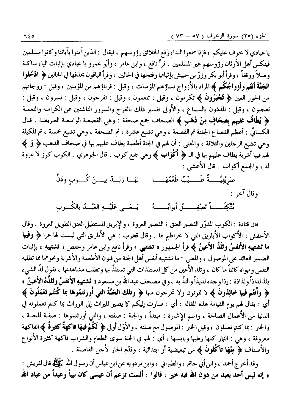 قَالَ قَتَادَةُ: الْكُوبُ الْمُدَوَّرُ الْقَصِيرُ الْعُنُقِ الْقَصِيرُ الْعُرْوَةِ، وَالْإِبْرِيقُ الْمُسْتَطِيلُ الْعُنُقِ الطَّوِيلُ الْعُرْوَةِ. وَقَالَ الْأَخْفَشُ: الْأَكْوَابُ الْأَبَارِيقُ الَّتِي لَا خَرَاطِيمَ لَهَا. وَقَالَ قُطْرُبٌ: هِيَ الأباريق التي ليست لها عرا وَفِيها مَا تَشْتَهِيهِ الْأَنْفُسُ وَتَلَذُّ الْأَعْيُنُ قَرَأَ الْجُمْهُورُ «تَشْتَهِي» وَقَرَأَ نَافِعٌ وَابْنُ عَامِرٍ وَحَفْصٌ «تَشْتَهِيهِ» بِإِثْبَاتِ الضَّمِيرِ الْعَائِدِ عَلَى الْمَوْصُولِ، وَالْمَعْنَى: مَا تَشْتَهِيهِ أَنْفُسُ أَهْلِ الْجَنَّةِ مِنْ فُنُونِ الْأَطْعِمَةِ وَالْأَشْرِبَةِ وَنَحْوِهِمَا مِمَّا تَطْلُبُهُ النَّفْسُ وَتَهْوَاهُ كَائِنًا مَا كَانَ، وَتَلَذُّ الْأَعْيُنُ مِنْ كُلِّ الْمُسْتَلَذَّاتِ الَّتِي تَسْتَلِذُّ بِهَا وَتَطْلُبُ مُشَاهَدَتَهَا، تَقُولُ لَذَّ الشَّيْءُ يَلَذُّ لَذَاذًا وَلَذَاذَةً: إِذَا وَجَدَهُ لَذِيذًا وَالْتَذَّ بِهِ، وَفِي مُصْحَفِ عَبْدِ اللَّهِ بْنِ مَسْعُودٍ «تَشْتَهِيهِ الْأَنْفُسُ وَتَلَذُّهُ الْأَعْيُنُ» وَأَنْتُمْ فِيها خالِدُونَ لَا تَمُوتُونَ وَلَا تُخْرَجُونَ مِنْهَا وَتِلْكَ الْجَنَّةُ الَّتِي أُورِثْتُمُوها بِما كُنْتُمْ تَعْمَلُونَ أَيْ: يُقَالُ لَهُمْ يَوْمَ الْقِيَامَةِ هَذِهِ الْمَقَالَةُ: أَيْ: صَارَتْ إِلَيْكُمْ كَمَا يَصِيرُ الْمِيرَاثُ إِلَى الْوَارِثِ بِمَا كُنْتُمْ تَعْمَلُونَهُ فِي الدُّنْيَا مِنَ الْأَعْمَالِ الصَّالِحَةِ، وَاسْمُ الْإِشَارَةِ: مُبْتَدَأٌ، وَالْجَنَّةُ: صِفَتُهُ، وَالَّتِي أُورِثْتُمُوهَا: صِفَةٌ لِلْجَنَّةِ، وَالْخَبَرُ: بِمَا كُنْتُمْ تَعْمَلُونَ، وَقِيلَ الْخَبَرُ: الْمَوْصُولُ مَعَ صِلَتِهِ، وَالْأَوَّلُ أَوْلَى لَكُمْ فِيها فاكِهَةٌ كَثِيرَةٌ الْفَاكِهَةُ مَعْرُوفَةٌ، وَهِيَ: الثِّمَارُ كُلُّهَا رَطْبُهَا وَيَابِسُهَا، أَيْ: لَهُمْ فِي الْجَنَّةِ سِوَى الطَّعَامِ وَالشَّرَابِ فَاكِهَةٌ كَثِيرَةُ الْأَنْوَاعِ وَالْأَصْنَافِ مِنْها تَأْكُلُونَ مِنْ تَبْعِيضِيَّةٌ أَوِ ابْتِدَائِيَّةٌ، وَقُدِّمَ الْجَارُّ لِأَجْلِ الْفَاصِلَةِ.