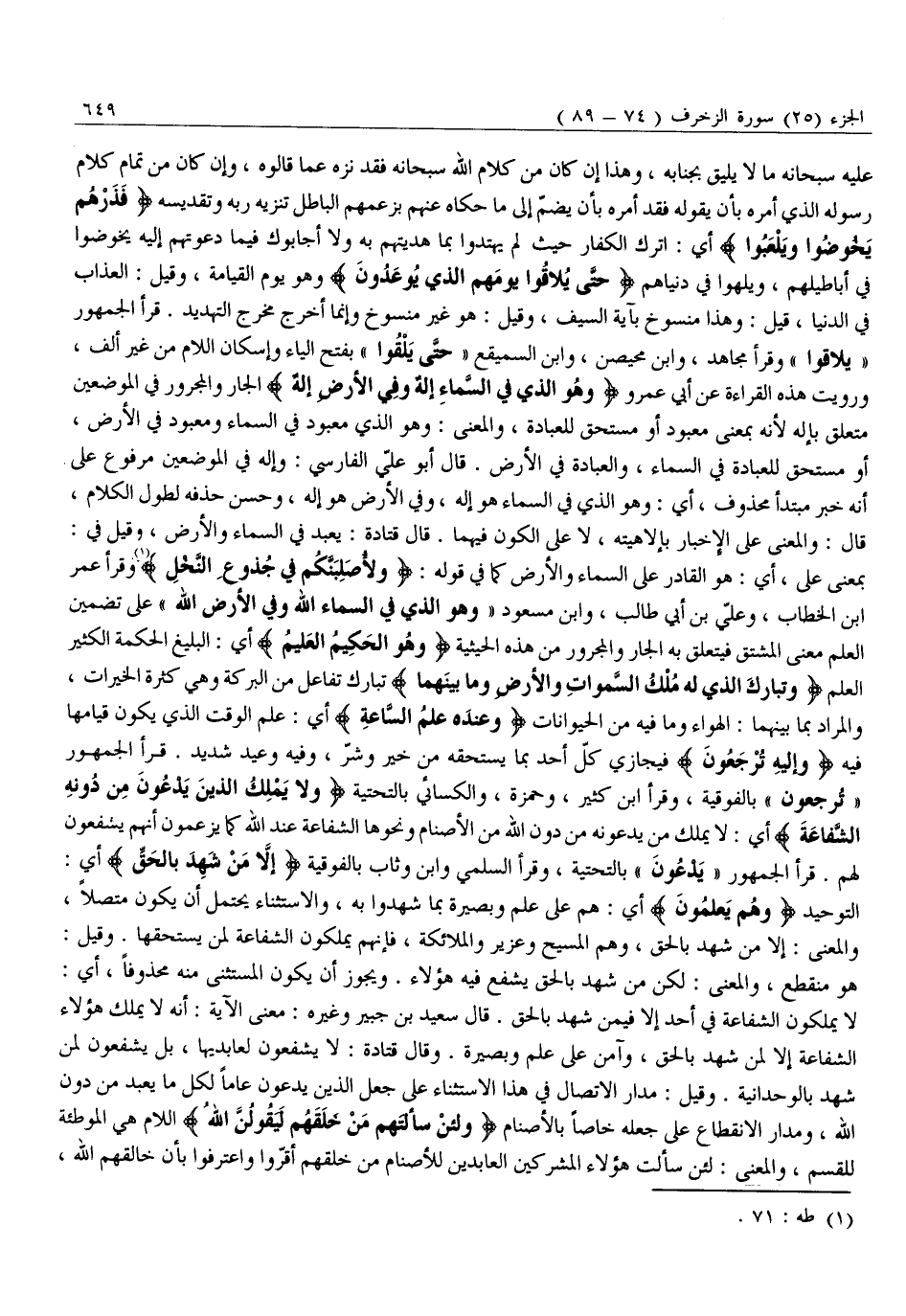 بِمَعْنَى عَلَى، أَيْ: هُوَ الْقَادِرُ عَلَى السَّمَاءِ وَالْأَرْضِ كَمَا فِي قَوْلِهِ: وَلَأُصَلِّبَنَّكُمْ فِي جُذُوعِ النَّخْلِ «1» وقرأ عمر ابن الْخَطَّابِ، وَعَلِيُّ بْنُ أَبِي طَالِبٍ، وَابْنُ مَسْعُودٍ «وَهُوَ الَّذِي فِي السَّمَاءِ اللَّهُ وَفِي الْأَرْضِ اللَّهُ» عَلَى تَضْمِينِ الْعَلَمِ مَعْنَى الْمُشْتَقِّ فَيَتَعَلَّقُ بِهِ الْجَارُّ وَالْمَجْرُورُ مِنْ هَذِهِ الْحَيْثِيَّةِ وَهُوَ الْحَكِيمُ الْعَلِيمُ أَيِ: الْبَلِيغُ الْحِكْمَةِ الْكَثِيرُ الْعِلْمِ وَتَبارَكَ الَّذِي لَهُ مُلْكُ السَّماواتِ وَالْأَرْضِ وَما بَيْنَهُما تَبَارَكَ تَفَاعَلَ مِنَ الْبَرَكَةِ وَهِيَ كَثْرَةُ الْخَيْرَاتِ، وَالْمُرَادُ بِمَا بَيْنَهُمَا: الْهَوَاءُ وَمَا فِيهِ مِنَ الْحَيَوَانَاتِ وَعِنْدَهُ عِلْمُ السَّاعَةِ أَيْ: عِلْمُ الْوَقْتِ الَّذِي يَكُونُ قِيَامُهَا فِيهِ وَإِلَيْهِ تُرْجَعُونَ فَيُجَازِي كُلَّ أَحَدٍ بِمَا يَسْتَحِقُّهُ مِنْ خَيْرٍ وَشَرٍّ، وَفِيهِ وَعِيدٌ شَدِيدٌ. قَرَأَ الْجُمْهُورُ «تُرْجَعُونَ» بِالْفَوْقِيَّةِ، وَقَرَأَ ابْنُ كَثِيرٍ، وَحَمْزَةُ، وَالْكِسَائِيُّ بِالتَّحْتِيَّةِ وَلا يَمْلِكُ الَّذِينَ يَدْعُونَ مِنْ دُونِهِ الشَّفاعَةَ أَيْ: لَا يَمْلِكُ مَنْ يَدْعُونَهُ مِنْ دُونِ اللَّهِ مِنَ الْأَصْنَامِ وَنَحْوِهَا الشَّفَاعَةَ عِنْدَ اللَّهِ كَمَا يَزْعُمُونَ أَنَّهُمْ يَشْفَعُونَ لَهُمْ. قَرَأَ الْجُمْهُورُ «يَدْعُونَ» بِالتَّحْتِيَّةِ، وَقَرَأَ السُّلَمِيُّ وَابْنُ وَثَّابٍ بِالْفَوْقِيَّةِ إِلَّا مَنْ شَهِدَ بِالْحَقِّ أَيِ: