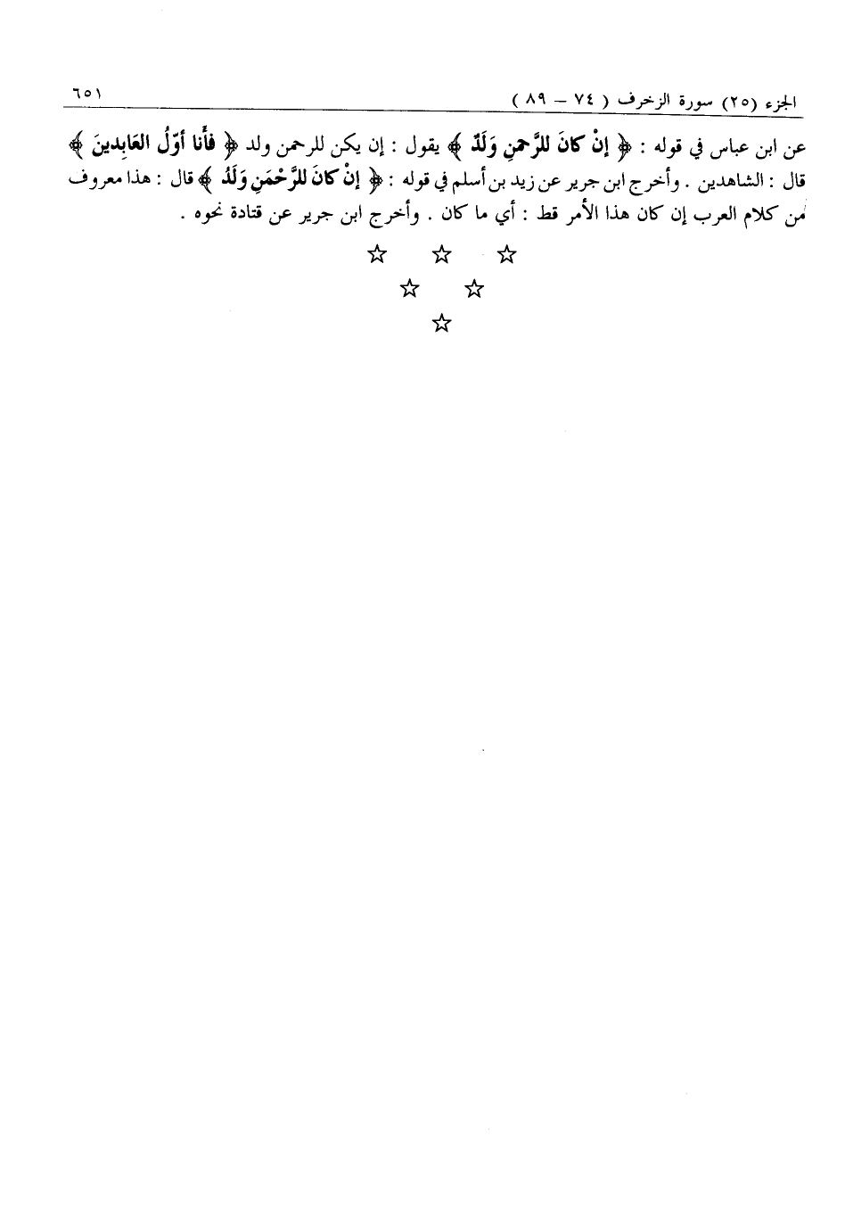عَنِ ابْنِ عَبَّاسٍ فِي قَوْلِهِ: إِنْ كانَ لِلرَّحْمنِ وَلَدٌ يَقُولُ: إِنْ يَكُنْ لِلرَّحْمَنِ وَلَدٌ فَأَنَا أَوَّلُ الْعابِدِينَ قَالَ: الشَّاهِدِينَ. وَأَخْرَجَ ابْنُ جَرِيرٍ عَنْ زَيْدِ بْنِ أَسْلَمَ فِي قَوْلِهِ: إِنْ كانَ لِلرَّحْمنِ وَلَدٌ قَالَ: هَذَا مَعْرُوفٌ مِنْ كَلَامِ الْعَرَبِ إِنْ كَانَ هَذَا الْأَمْرُ قَطُّ: أَيْ مَا كَانَ. وَأَخْرَجَ ابْنُ جَرِيرٍ عن قتادة نحوه.