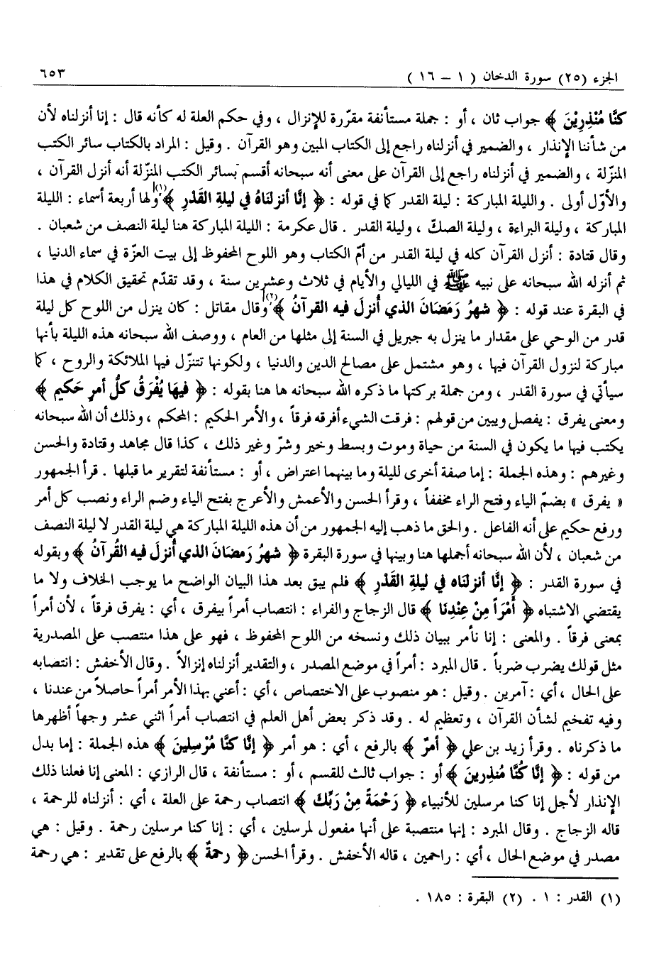 إِنَّا كُنَّا مُنْذِرِينَ جَوَابٌ ثَانٍ، أَوْ: جُمْلَةٌ مُسْتَأْنَفَةٌ مُقَرِّرَةٌ لِلْإِنْزَالِ، وَفِي حُكْمِ الْعِلَّةِ لَهُ كَأَنَّهُ قَالَ: إِنَّا أَنْزَلْنَاهُ لِأَنَّ مِنْ شَأْنِنَا الْإِنْذَارَ، وَالضَّمِيرُ فِي أَنْزَلْنَاهُ رَاجِعٌ إِلَى الْكِتَابِ الْمُبِينِ وَهُوَ الْقُرْآنُ. وَقِيلَ: الْمُرَادُ بِالْكِتَابِ سَائِرُ الْكُتُبِ الْمُنَزَّلَةِ، وَالضَّمِيرُ فِي أَنْزَلْنَاهُ رَاجِعٌ إِلَى الْقُرْآنِ عَلَى مَعْنَى أَنَّهُ سُبْحَانَهُ أَقْسَمَ بِسَائِرِ الْكُتُبِ الْمُنَزَّلَةِ أَنَّهُ أَنْزَلَ الْقُرْآنَ، وَالْأَوَّلُ أَوْلَى. وَاللَّيْلَةُ الْمُبَارَكَةُ: لَيْلَةُ الْقَدْرِ كَمَا فِي قَوْلِهِ: إِنَّا أَنْزَلْناهُ فِي لَيْلَةِ الْقَدْرِ «1» وَلَهَا أَرْبَعَةُ أَسْمَاءٍ: اللَّيْلَةُ الْمُبَارَكَةُ، وَلَيْلَةُ الْبَرَاءَةِ، وَلَيْلَةُ الصَّكِّ، وَلَيْلَةُ الْقَدْرِ. قَالَ عِكْرِمَةُ: اللَّيْلَةُ الْمُبَارَكَةُ هُنَا لَيْلَةُ النِّصْفِ مِنْ شَعْبَانَ.