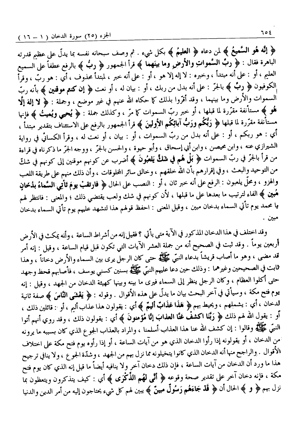 إِنَّهُ هُوَ السَّمِيعُ لِمَنْ دَعَاهُ الْعَلِيمُ بِكُلِّ شَيْءٍ. ثُمَّ وَصَفَ سُبْحَانَهُ نَفْسَهُ بِمَا يَدُلُّ عَلَى عَظِيمِ قُدْرَتِهِ الْبَاهِرَةِ فَقَالَ: رَبِّ السَّماواتِ وَالْأَرْضِ وَما بَيْنَهُما قَرَأَ الْجُمْهُورُ «رَبُّ» بِالرَّفْعِ عَطْفًا عَلَى السَّمِيعُ الْعَلِيمُ، أَوْ: عَلَى أَنَّهُ مُبْتَدَأٌ، وَخَبَرَهُ: لَا إِلَهَ إِلَّا هُوَ، أَوْ: عَلَى أَنَّهُ خَبَرٌ، لِمُبْتَدَأٍ مَحْذُوفٍ، أَيْ: هُوَ رَبٌّ، وَقَرَأَ الْكُوفِيُّونَ رَبِّ بِالْجَرِّ: عَلَى أَنَّهُ بَدَلٌ مِنْ رَبِّكَ، أَوْ: بَيَانٌ لَهُ، أَوْ نعت إِنْ كُنْتُمْ مُوقِنِينَ بأنه ربّ السموات والأرض وما بينهما، وقد أقرّوا بِذَلِكَ كَمَا حَكَاهُ اللَّهُ عَنْهُمْ فِي غَيْرِ مَوْضِعٍ، وَجُمْلَةُ: لَا إِلهَ إِلَّا هُوَ مُسْتَأْنَفَةٌ مقرّرة لما قبلها، أو خبر ربّ السموات كَمَا مَرَّ، وَكَذَلِكَ جُمْلَةُ: يُحْيِي وَيُمِيتُ فَإِنَّهَا مُسْتَأْنَفَةٌ مُقَرِّرَةٌ لِمَا قَبْلَهَا رَبُّكُمْ وَرَبُّ آبائِكُمُ الْأَوَّلِينَ قَرَأَ الْجُمْهُورُ بِالرَّفْعِ عَلَى الِاسْتِئْنَافِ بِتَقْدِيرِ مُبْتَدَأٍ، أَيْ: هُوَ رَبُّكُمْ، أَوْ: عَلَى أَنَّهُ بدل من ربّ السموات، أَوْ: بَيَانٌ، أَوْ نَعْتٌ لَهُ، وَقَرَأَ الْكِسَائِيُّ فِي رِوَايَةِ الشِّيرَازِيِّ عَنْهُ، وَابْنُ مُحَيْصِنٍ، وَابْنُ أَبِي إِسْحَاقَ، وَأَبُو حَيْوَةَ، وَالْحَسَنُ بِالْجَرِّ، وَوَجْهُ الْجَرِّ مَا ذَكَرْنَاهُ فِي قِرَاءَةِ مَنْ قَرَأَ بالجرّ في ربّ السموات بَلْ هُمْ فِي شَكٍّ يَلْعَبُونَ أَضْرَبَ عَنْ كَوْنِهِمْ مُوقِنِينَ إِلَى كَوْنِهِمْ فِي شَكٍّ مِنَ التوحيد والبعث، وفي إقرارهم بأن الله خلقهم، وَخَالِقُ سَائِرِ الْمَخْلُوقَاتِ، وَأَنَّ ذَلِكَ مِنْهُمْ عَلَى طَرِيقَةِ اللَّعِبِ وَالْهَزْوِ، وَمَحَلُّ يَلْعَبُونَ: الرَّفْعُ عَلَى أَنَّهُ خَبَرٌ ثَانٍ، أَوِ: النُّصْبُ عَلَى الْحَالِ فَارْتَقِبْ يَوْمَ تَأْتِي السَّماءُ بِدُخانٍ مُبِينٍ الْفَاءُ لِتَرْتِيبِ مَا بَعْدَهَا عَلَى مَا قَبْلَهَا، لِأَنَّ كَوْنَهُمْ فِي شَكٍّ وَلَعِبٍ يَقْتَضِي ذَلِكَ وَالْمَعْنَى: فَانْتَظِرْ لَهُمْ يَا مُحَمَّدُ يَوْمَ تَأْتِي السَّمَاءُ بِدُخَانٍ مُبِينٍ، وَقِيلَ الْمَعْنَى: احْفَظْ قَوْلَهُمْ هَذَا لِتَشْهَدَ عَلَيْهِمْ يَوْمَ تَأْتِي السَّمَاءُ بِدُخَانٍ مُبِينٍ.