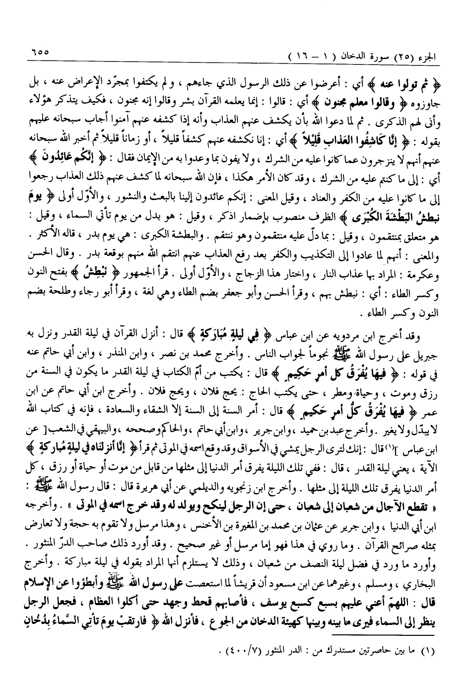 وَأَوْرَدَ مَا وَرَدَ فِي فَضْلِ لَيْلَةِ النِّصْفِ مِنْ شَعْبَانَ، وَذَلِكَ لَا يَسْتَلْزِمُ أَنَّهَا الْمُرَادُ بِقَوْلِهِ فِي لَيْلَةٍ مُبَارَكَةٍ. وَأَخْرَجَ الْبُخَارِيُّ، وَمُسْلِمٌ، وَغَيْرُهُمَا عَنِ ابْنِ مَسْعُودٍ أَنَّ قُرَيْشًا لَمَّا اسْتَعْصَتْ عَلَى رَسُولِ اللَّهِ صَلَّى اللَّهُ عَلَيْهِ وَسَلَّمَ وَأَبْطَئُوا عَنِ الْإِسْلَامِ قَالَ: اللَّهُمَّ أَعِنِّي عَلَيْهِمْ بِسَبْعٍ كَسَبْعِ يُوسُفَ، فَأَصَابَهُمْ قَحْطٌ وَجَهْدٌ حَتَّى أَكَلُوا الْعِظَامَ، فَجَعَلَ الرَّجُلُ يَنْظُرُ إِلَى السَّمَاءِ فَيَرَى مَا بَيْنَهُ وَبَيْنَهَا كَهَيْئَةِ الدُّخَانِ مِنَ الْجُوعِ، فَأَنْزَلَ اللَّهُ فَارْتَقِبْ يَوْمَ تَأْتِي السَّماءُ بِدُخانٍ