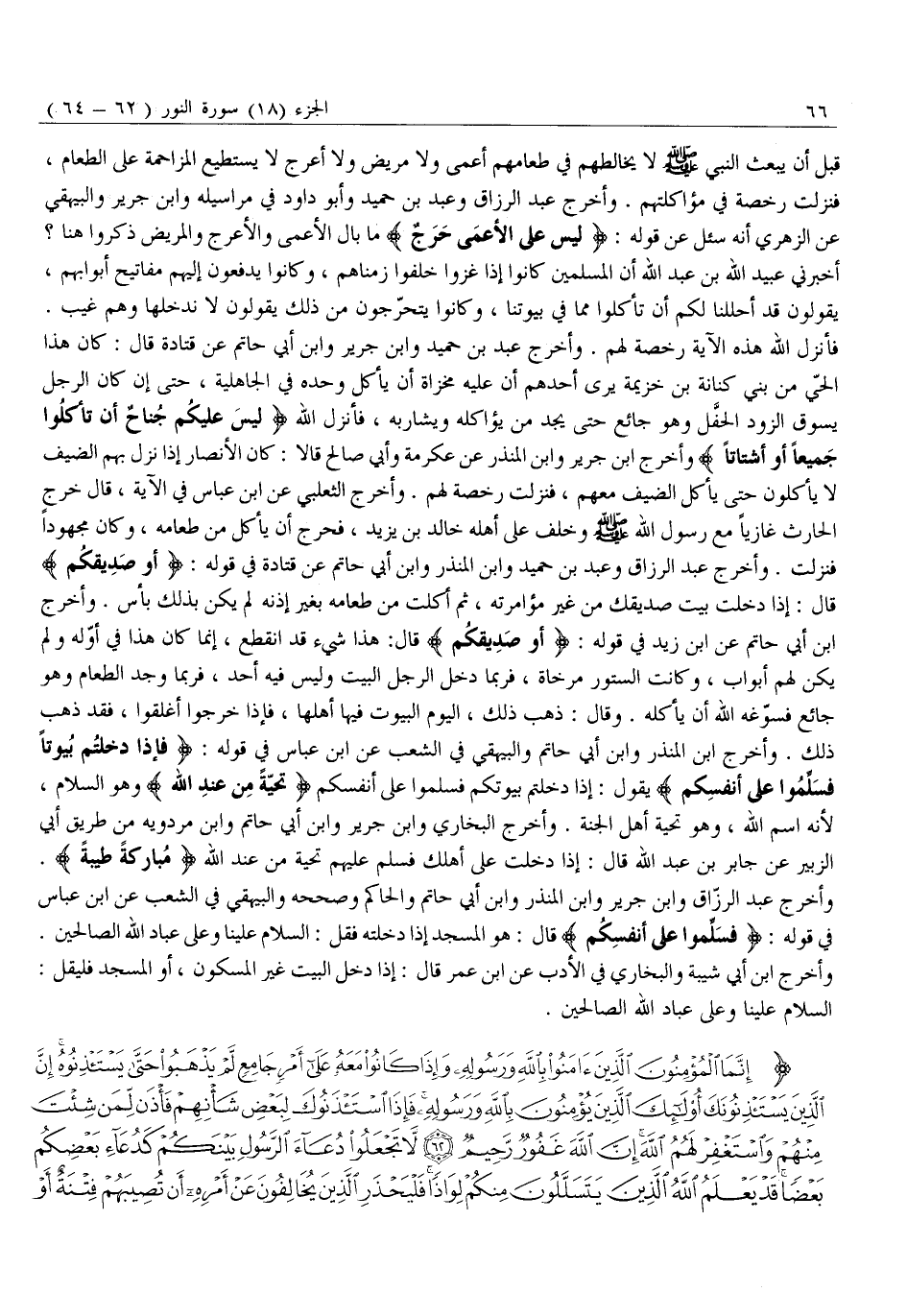 فَأَنْزَلَ اللَّهُ هَذِهِ الْآيَةَ رُخْصَةً لَهُمْ. وَأَخْرَجَ عَبْدُ بْنُ حُمَيْدٍ وَابْنُ جَرِيرٍ وَابْنُ أَبِي حَاتِمٍ عَنْ قَتَادَةَ قَالَ: كَانَ هَذَا الْحَيُّ مِنْ بَنِيَ كِنَانَةَ بْنِ خُزَيْمَةَ يَرَى أَحَدُهُمْ أَنَّ عَلَيْهِ مَخْزَاةَ أَنْ يَأْكُلَ وَحْدَهُ فِي الْجَاهِلِيَّةِ، حَتَّى إِنْ كَانَ الرَّجُلُ يَسُوقُ الزَّوْدَ الْحَفْلَ وَهُوَ جَائِعٌ حَتَّى يَجِدَ مَنْ يُؤَاكِلُهُ وَيُشَارِبُهُ، فَأَنْزَلَ اللَّهُ لَيْسَ عَلَيْكُمْ جُناحٌ أَنْ تَأْكُلُوا جَمِيعاً أَوْ أَشْتاتاً وَأَخْرَجَ ابْنُ جَرِيرٍ وَابْنُ الْمُنْذِرِ عَنْ عِكْرِمَةَ وَأَبِي صَالِحٍ قالا: كان الْأَنْصَارُ إِذَا نَزَلَ بِهِمُ الضَّيْفُ لَا يَأْكُلُونَ حَتَّى يَأْكُلَ الضَّيْفُ مَعَهُمْ، فَنَزَلَتْ رُخْصَةً لَهُمْ. وَأَخْرَجَ الثَّعْلَبِيُّ عَنِ ابْنِ عَبَّاسٍ فِي الْآيَةِ، قَالَ خَرَجَ الْحَارِثُ غَازِيًا مَعَ رَسُولِ اللَّهِ صَلَّى اللَّهُ عَلَيْهِ وَسَلَّمَ وَخَلَّفَ عَلَى أَهْلِهِ خَالِدَ بْنَ يَزِيدَ، فَحَرِجَ أَنْ يَأْكُلَ مِنْ طَعَامِهِ، وَكَانَ مَجْهُودًا فَنَزَلَتْ. وَأَخْرَجَ عَبْدُ الرَّزَّاقِ وَعَبْدُ بْنُ حُمَيْدٍ وَابْنُ الْمُنْذِرِ وَابْنُ أَبِي حَاتِمٍ عَنْ قَتَادَةَ فِي قَوْلِهِ: أَوْ صَدِيقِكُمْ قَالَ: إِذَا دَخَلْتَ بَيْتَ صَدِيقِكَ مِنْ غَيْرِ مُؤَامَرَتِهِ، ثُمَّ أَكَلْتَ مِنْ طَعَامِهِ بِغَيْرِ إِذْنِهِ لَمْ يَكُنْ بِذَلِكَ بَأْسٌ. وَأَخْرَجَ ابْنُ أَبِي حَاتِمٍ عَنِ ابْنِ زَيْدٍ فِي قَوْلِهِ: أَوْ صَدِيقِكُمْ قَالَ: هَذَا شَيْءٌ قَدِ انْقَطَعَ، إِنَّمَا كَانَ هَذَا فِي أَوَّلِهِ وَلَمْ يَكُنْ لَهُمْ أَبْوَابٌ، وَكَانَتِ السُّتُورُ مُرْخَاةً، فَرُبَّمَا دَخَلَ الرَّجُلُ الْبَيْتَ وَلَيْسَ فِيهِ أَحَدٌ، فَرُبَّمَا وَجَدَ الطَّعَامَ وَهُوَ جَائِعٌ فَسَوَّغَهُ اللَّهُ أَنْ يَأْكُلَهُ. وَقَالَ: ذَهَبَ ذَلِكَ، الْيَوْمَ الْبُيُوتُ فِيهَا أَهْلُهَا، فَإِذَا خَرَجُوا أَغْلَقُوا، فَقَدْ ذَهَبَ ذَلِكَ. وَأَخْرَجَ ابْنُ الْمُنْذِرِ وَابْنُ أَبِي حَاتِمٍ وَالْبَيْهَقِيُّ فِي الشُّعَبِ عَنِ ابْنِ عَبَّاسٍ فِي قَوْلِهِ: فَإِذا دَخَلْتُمْ بُيُوتاً فَسَلِّمُوا عَلى أَنْفُسِكُمْ يَقُولُ: إِذَا دَخَلْتُمْ بُيُوتَكُمْ فَسَلِّمُوا عَلَى أَنْفُسِكُمْ تَحِيَّةً مِنْ عِنْدِ اللَّهِ وَهُوَ السَّلَامُ، لِأَنَّهُ اسْمُ اللَّهِ، وَهُوَ تَحِيَّةُ أَهْلِ الْجَنَّةِ. وَأَخْرَجَ الْبُخَارِيُّ وَابْنُ جَرِيرٍ وَابْنُ أَبِي حَاتِمٍ وَابْنُ مَرْدَوَيْهِ مِنْ طَرِيقِ أَبِي الزُّبَيْرِ عَنْ جَابِرِ بْنِ عَبْدِ اللَّهِ قَالَ: إِذَا دَخَلْتَ عَلَى أَهْلِكَ فَسَلِّمَ عَلَيْهِمْ تَحِيَّةً مِنْ عِنْدِ اللَّهِ مُبارَكَةً طَيِّبَةً.