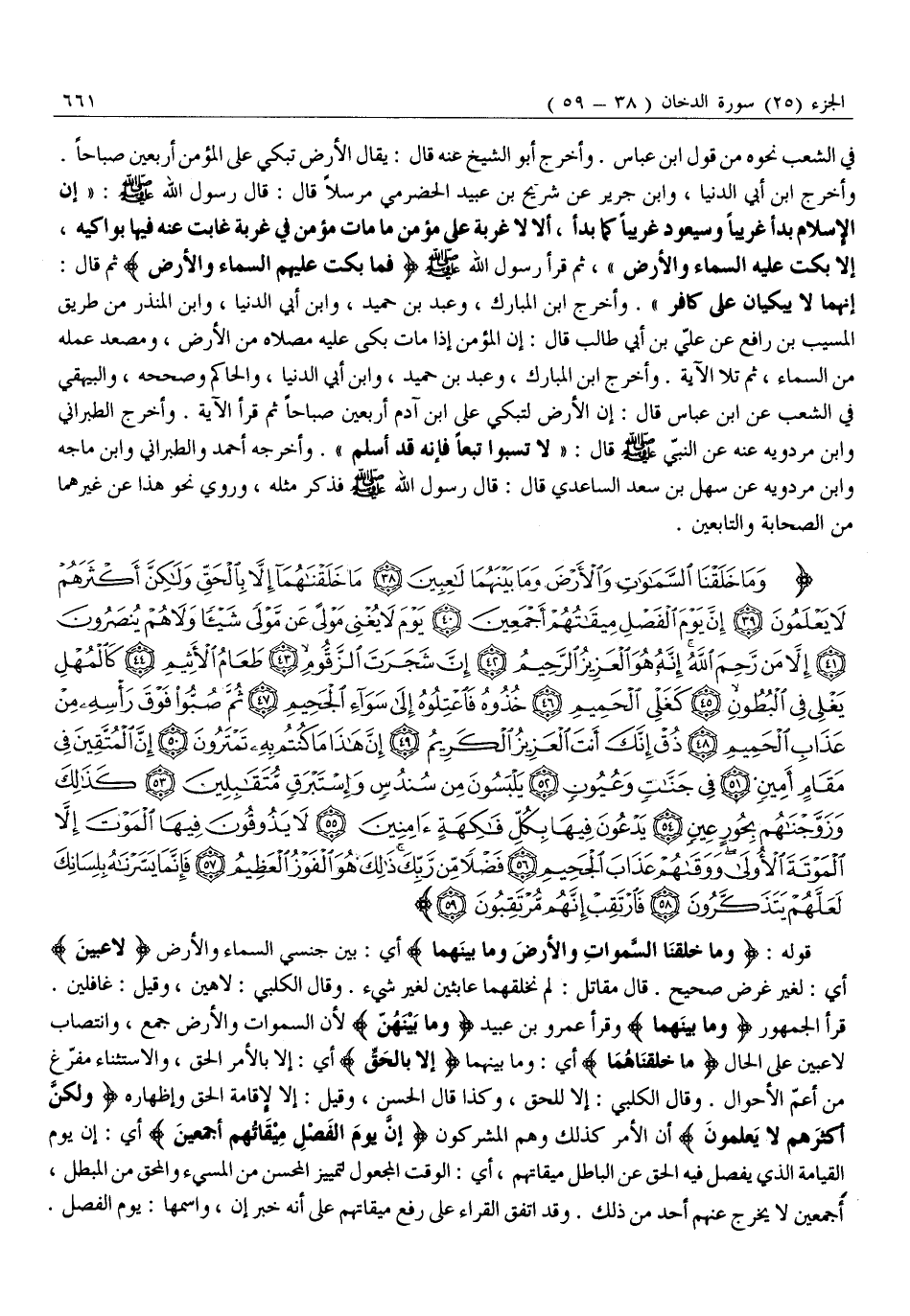 وَما خَلَقْنَا السَّماواتِ وَالْأَرْضَ وَما بَيْنَهُما لاعِبِينَ (38) مَا خَلَقْناهُما إِلاَّ بِالْحَقِّ وَلكِنَّ أَكْثَرَهُمْ لَا يَعْلَمُونَ (39) إِنَّ يَوْمَ الْفَصْلِ مِيقاتُهُمْ أَجْمَعِينَ (40) يَوْمَ لَا يُغْنِي مَوْلًى عَنْ مَوْلًى شَيْئاً وَلا هُمْ يُنْصَرُونَ (41) إِلاَّ مَنْ رَحِمَ اللَّهُ إِنَّهُ هُوَ الْعَزِيزُ الرَّحِيمُ (42)