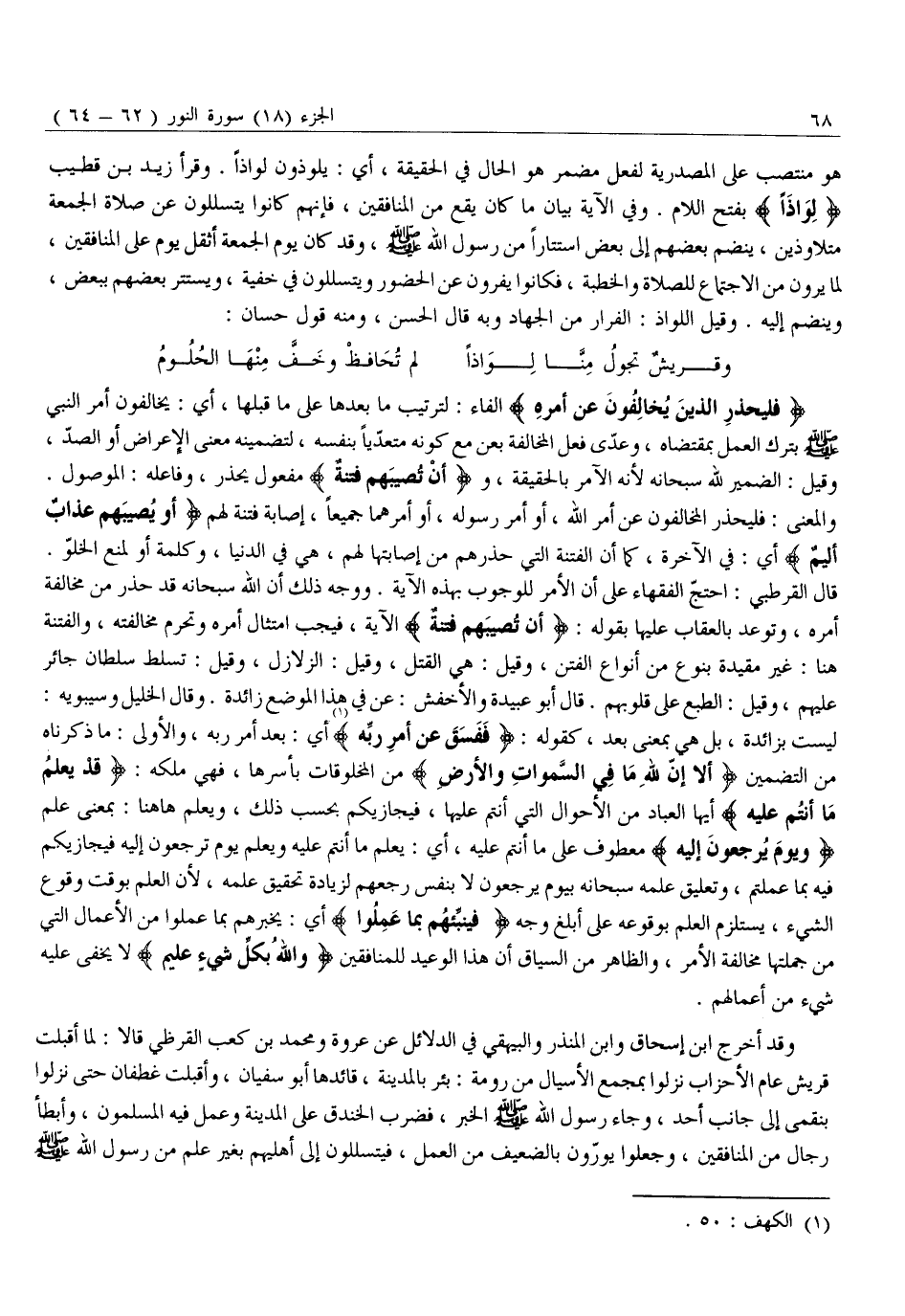 فَلْيَحْذَرِ الَّذِينَ يُخالِفُونَ عَنْ أَمْرِهِ الْفَاءُ: لِتَرْتِيبِ مَا بَعْدَهَا عَلَى مَا قَبْلَهَا، أَيْ: يُخَالِفُونَ أَمْرَ النَّبِيِّ صَلَّى اللَّهُ عَلَيْهِ وَسَلَّمَ بِتَرْكِ الْعَمَلِ بِمُقْتَضَاهُ، وَعُدِّيَ فِعْلُ الْمُخَالَفَةِ بِعَنْ مَعَ كَوْنِهِ مُتَعَدِّيًا بِنَفْسِهِ، لِتَضْمِينِهِ مَعْنَى الْإِعْرَاضِ أَوِ الصَّدِّ، وَقِيلَ: الضَّمِيرُ لِلَّهِ سُبْحَانَهُ لأنه الآمر بالحقيقة، وأَنْ تُصِيبَهُمْ فِتْنَةٌ مَفْعُولُ يَحْذَرْ، وَفَاعِلُهُ: الْمَوْصُولُ.