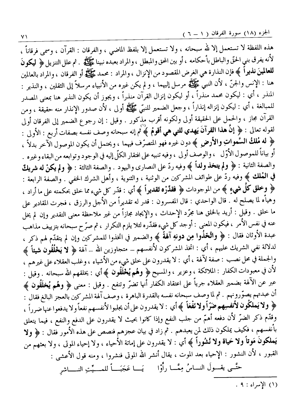 هَذِهِ اللَّفْظَةُ لَا تُسْتَعْمَلُ إِلَّا لِلَّهِ سُبْحَانَهُ، وَلَا تُسْتَعْمَلُ إِلَّا بِلَفْظِ الْمَاضِي، وَالْفَرْقَانُ: الْقُرْآنُ، وسمى فرقانا، لأنه يفرق بني الْحَقِّ وَالْبَاطِلِ بِأَحْكَامِهِ، أَوْ بَيْنَ الْمُحِقِّ وَالْمُبْطِلِ، والمراد بعبده نبينا صلّى الله عليه وَسَلَّمَ. ثُمَّ عَلَّلَ التَّنْزِيلَ لِيَكُونَ لِلْعالَمِينَ نَذِيراً فَإِنَّ النِّذَارَةَ هِيَ الْغَرَضُ الْمَقْصُودُ مِنَ الْإِنْزَالِ، والمراد: محمد صلّى الله عليه وَسَلَّمَ أَوِ الْفَرْقَانُ، وَالْمُرَادُ بِالْعَالَمِينَ هُنَا: الْإِنْسُ والجنّ، لأن النبي صلّى الله عليه وَسَلَّمَ مُرْسَلٌ إِلَيْهِمَا، وَلَمْ يَكُنْ غَيْرُهُ مِنَ الْأَنْبِيَاءِ مُرْسَلًا إِلَى الثَّقَلَيْنِ، وَالنَّذِيرُ: