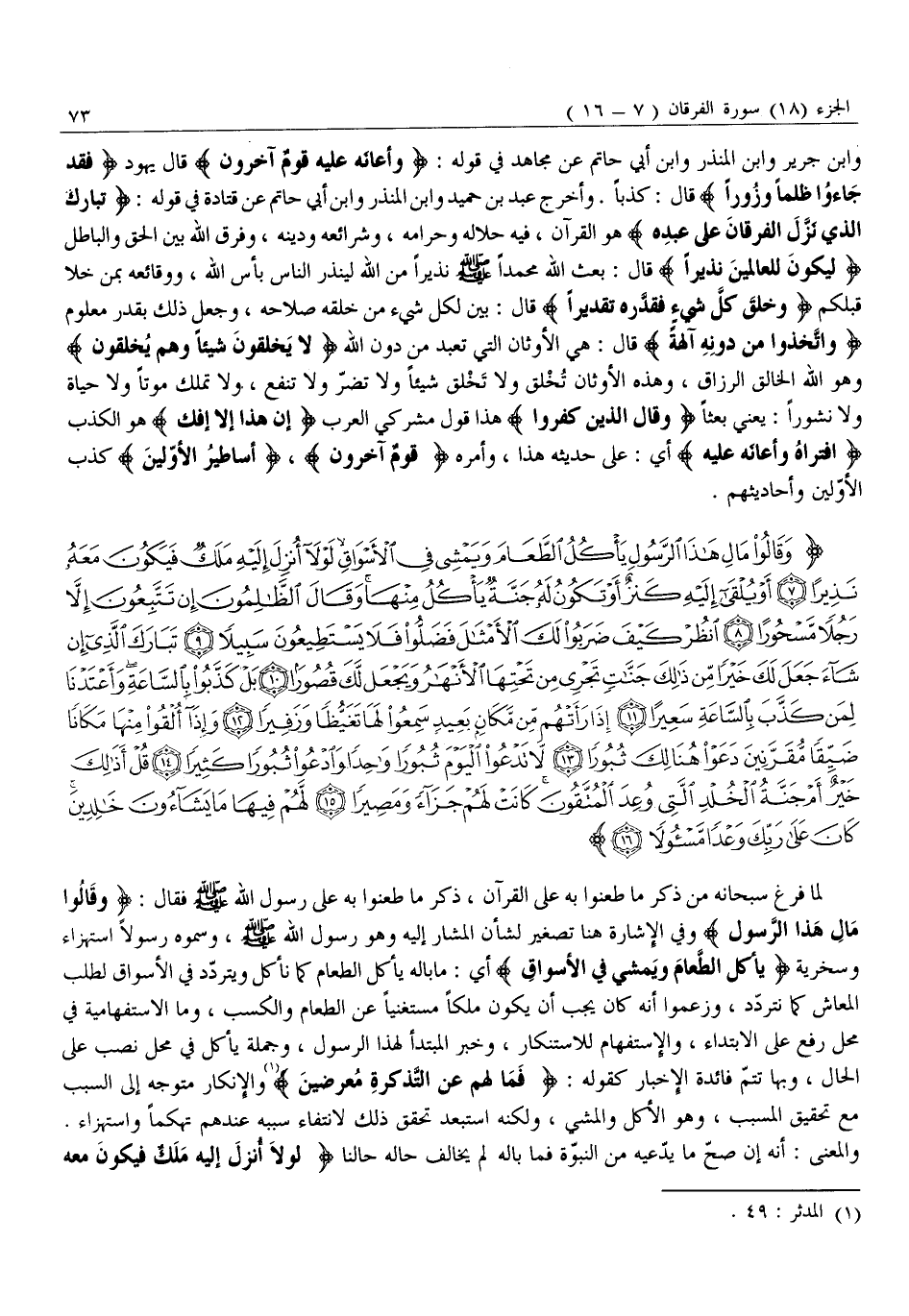وَابْنُ جَرِيرٍ وَابْنُ الْمُنْذِرِ وَابْنُ أَبِي حَاتِمٍ عَنْ مُجَاهِدٍ فِي قَوْلِهِ: وَأَعانَهُ عَلَيْهِ قَوْمٌ آخَرُونَ قال يهود فَقَدْ جاؤُ ظُلْماً وَزُوراً قَالَ: كَذِبًا. وَأَخْرَجَ عَبْدُ بْنُ حُمَيْدٍ وَابْنُ الْمُنْذِرِ وَابْنُ أبي حاتم عن قَتَادَةَ فِي قَوْلِهِ: تَبارَكَ الَّذِي نَزَّلَ الْفُرْقانَ عَلى عَبْدِهِ هُوَ الْقُرْآنُ، فِيهِ حَلَالُهُ وَحَرَامُهُ، وَشَرَائِعُهُ وَدِينُهُ، وَفَرَّقَ اللَّهُ بَيْنَ الْحَقِّ وَالْبَاطِلِ لِيَكُونَ لِلْعالَمِينَ نَذِيراً قَالَ: بَعَثَ اللَّهُ مُحَمَّدًا صَلَّى اللَّهُ عَلَيْهِ وَسَلَّمَ نَذِيرًا مِنَ اللَّهِ لِيُنْذِرَ النَّاسَ بَأْسَ اللَّهِ، وَوَقَائِعَهُ بِمَنْ خَلَا قَبْلَكُمْ وَخَلَقَ كُلَّ شَيْءٍ فَقَدَّرَهُ تَقْدِيراً قَالَ: بَيَّنَ لِكُلِّ شَيْءٍ مِنْ خَلْقِهِ صَلَاحَهُ، وَجَعَلَ ذَلِكَ بِقَدْرٍ مَعْلُومٍ وَاتَّخَذُوا مِنْ دُونِهِ آلِهَةً قَالَ: هِيَ الْأَوْثَانُ الَّتِي تُعْبَدُ مِنْ دُونِ اللَّهِ لَا يَخْلُقُونَ شَيْئاً وَهُمْ يُخْلَقُونَ وهو الله الخالق الرزاق، وَهَذِهِ الْأَوْثَانُ تُخْلَقُ وَلَا تَخْلُقُ شَيْئًا وَلَا تَضُرُّ وَلَا تَنْفَعُ، وَلَا تَمْلِكُ مَوْتًا وَلَا حَيَاةً وَلَا نُشُورًا: يَعْنِي بَعْثًا وَقالَ الَّذِينَ كَفَرُوا هَذَا قَوْلُ مُشْرِكِي الْعَرَبِ إِنْ هَذا إِلَّا إِفْكٌ هُوَ الْكَذِبُ افْتَراهُ وَأَعانَهُ عَلَيْهِ أَيْ: عَلَى حَدِيثِهِ هَذَا، وَأَمْرِهِ قَوْمٌ آخَرُونَ، أَساطِيرُ الْأَوَّلِينَ كذب الأوّلين وأحاديثهم.