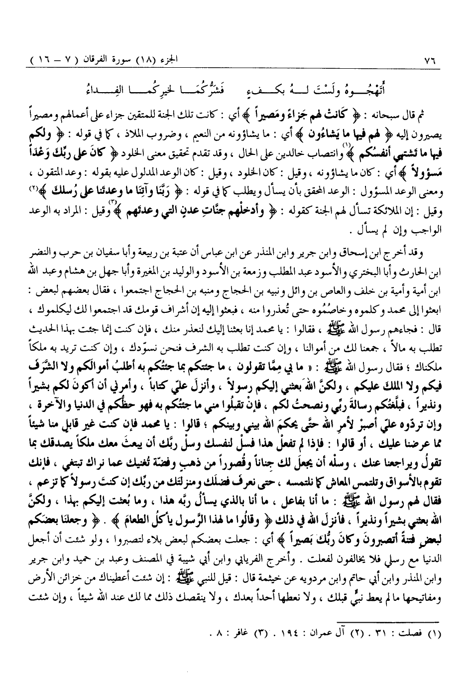 ابْعَثُوا إِلَى مُحَمَّدٍ وَكَلِّمُوهُ وَخَاصِمُوهُ حَتَّى تُعْذَرُوا مِنْهُ، فَبَعَثُوا إِلَيْهِ إِنَّ أَشْرَافَ قَوْمِكَ قَدِ اجْتَمَعُوا لَكَ لِيُكَلِّمُوكَ، قَالَ: فجاءهم رَسُولِ اللَّهِ صَلَّى اللَّهُ عَلَيْهِ وَسَلَّمَ، فَقَالُوا: يَا مُحَمَّدُ إِنَّا بَعَثْنَا إِلَيْكَ لِنُعَذِّرَ مِنْكَ، فَإِنْ كُنْتَ إِنَّمَا جِئْتَ بِهَذَا الْحَدِيثِ تَطْلُبُ بِهِ مَالًا، جَمَعْنَا لَكَ مِنْ أَمْوَالِنَا، وَإِنْ كُنْتَ تَطْلُبُ بِهِ الشَّرَفَ فَنَحْنُ نُسَوِّدُكَ، وَإِنْ كُنْتَ تُرِيدُ بِهِ مُلْكًا مَلَّكْنَاكَ فَقَالَ رَسُولُ اللَّهِ صَلَّى اللَّهُ عَلَيْهِ وَسَلَّمَ: «مَا بِي مِمَّا تَقُولُونَ، مَا جِئْتُكُمْ بما جِئْتُكُمْ بِهِ أَطْلُبُ أَمْوَالَكُمْ وَلَا الشَّرَفَ فِيكُمْ وَلَا الْمُلْكَ عَلَيْكُمْ، وَلَكِنَّ اللَّهَ بَعَثَنِي إِلَيْكُمْ رَسُولًا، وَأَنْزَلَ عَلِيَّ كِتَابًا، وَأَمَرَنِي أَنْ أَكُونَ لَكُمْ بَشِيرًا وَنَذِيرًا، فَبَلَّغْتُكُمْ رِسَالَةَ رَبِّي وَنَصَحْتُ لَكُمْ، فَإِنْ تَقْبَلُوا مِنِّي مَا جِئْتُكُمْ بِهِ فَهُوَ حَظُّكُمْ فِي الدُّنْيَا وَالْآخِرَةِ، وَإِنْ تَرُدُّوهُ عَلَيَّ أَصْبِرْ لِأَمْرِ اللَّهِ حَتَّى يَحْكُمَ اللَّهُ بَيْنِي وَبَيْنَكُمْ قَالُوا: يَا مُحَمَّدُ فَإِنْ كُنْتَ غَيْرَ قَابِلٍ مِنَّا شَيْئًا مِمَّا عَرَضْنَا عَلَيْكَ، أَوْ قَالُوا: فَإِذَا لَمْ تَفْعَلْ هَذَا فَسَلْ لِنَفْسِكَ وَسَلْ رَبَّكَ أَنْ يَبْعَثَ مَعَكَ مَلَكًا يُصَدِّقُكَ بِمَا تَقُولُ وَيُرَاجِعُنَا عَنْكَ، وَسَلْهُ أَنْ يَجْعَلَ لَكَ جِنَانًا وَقُصُورًا مِنْ ذَهَبٍ وَفِضَّةٍ تُغْنِيكَ عَمَّا نَرَاكَ تَبْتَغِي، فَإِنَّكَ تَقُومُ بِالْأَسْوَاقِ وَتَلْتَمِسُ الْمَعَاشَ كَمَا نَلْتَمِسُهُ، حَتَّى نَعْرِفَ فَضْلَكَ وَمَنْزِلَتَكَ مِنْ رَبِّكِ إِنْ كُنْتَ رَسُولًا كَمَا تَزْعُمُ، فَقَالَ لَهُمْ رَسُولُ اللَّهِ صَلَّى اللَّهُ عَلَيْهِ وَسَلَّمَ: مَا أَنَا بِفَاعِلٍ، مَا أَنَا بِالَّذِي يَسْأَلُ رَبَّهُ هَذَا، وَمَا بُعِثْتُ إِلَيْكُمْ بِهَذَا، وَلَكِنَّ اللَّهَ بَعَثَنِي بَشِيرًا وَنَذِيرًا، فَأَنْزَلَ اللَّهُ فِي ذَلِكَ وَقالُوا مالِ هذَا الرَّسُولِ يَأْكُلُ الطَّعامَ. وَجَعَلْنا بَعْضَكُمْ لِبَعْضٍ فِتْنَةً أَتَصْبِرُونَ وَكانَ رَبُّكَ بَصِيراً أَيْ: جَعَلْتُ بَعْضَكُمْ لِبَعْضٍ بَلَاءً لِتَصْبِرُوا، وَلَوْ شِئْتُ أَنْ أَجْعَلَ الدُّنْيَا مَعَ رُسُلِي فَلَا يُخَالِفُونَ لَفَعَلْتُ. وَأَخْرَجَ الْفِرْيَابِيُّ وَابْنُ أَبِي شَيْبَةَ فِي الْمُصَنَّفِ وَعَبْدُ بْنُ حُمَيْدٍ وَابْنُ جَرِيرٍ وَابْنُ الْمُنْذِرِ وَابْنُ أَبِي حَاتِمٍ وَابْنُ مَرْدَوَيْهِ عَنْ خَيْثَمَةَ قَالَ: قِيلَ لِلنَّبِيِّ صَلَّى اللَّهُ عليه وَسَلَّمَ: إِنْ شِئْتَ أَعْطَيْنَاكَ مِنْ خَزَائِنِ الْأَرْضِ وَمَفَاتِيحِهَا مَا لَمْ يُعْطَ نَبِيٌّ قَبْلَكَ، وَلَا نُعْطِهَا أَحَدًا بَعْدَكَ، وَلَا يُنْقِصُكَ ذَلِكَ مِمَّا لك عند الله شيئا، وإن شئت