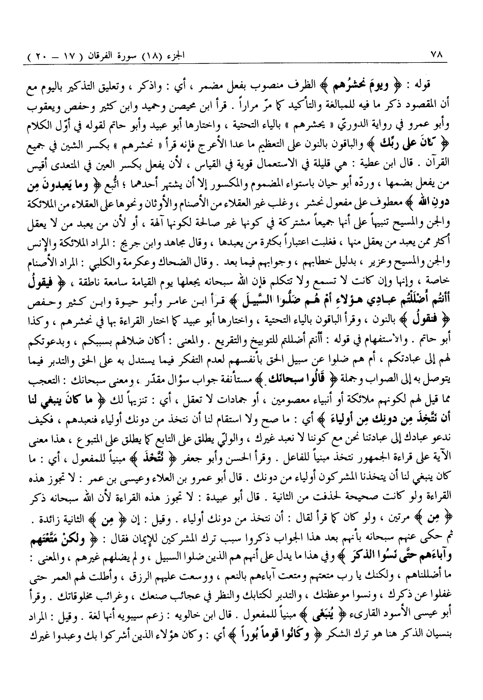 قَوْلُهُ: وَيَوْمَ يَحْشُرُهُمْ الظَّرْفُ مَنْصُوبٌ بِفِعْلٍ مُضْمَرٍ، أَيْ: وَاذْكُرْ، وَتَعْلِيقُ التَّذْكِيرِ بِالْيَوْمِ مَعَ أَنَّ الْمَقْصُودَ ذِكْرُ مَا فِيهِ لِلْمُبَالَغَةِ وَالتَّأْكِيدِ كَمَا مَرَّ مِرَارًا. قَرَأَ ابْنُ مُحَيْصِنٍ وَحُمَيْدٌ وَابْنُ كَثِيرٍ وَحَفْصٌ وَيَعْقُوبُ وَأَبُو عَمْرٍو فِي رِوَايَةِ الدُّورِيِّ «يَحْشُرُهُمْ» بِالْيَاءِ التَّحْتِيَّةِ، وَاخْتَارَهَا أَبُو عُبَيْدٍ وَأَبُو حَاتِمٍ لِقَوْلِهِ فِي أَوَّلِ الْكَلَامِ كانَ عَلى رَبِّكَ وَالْبَاقُونَ بِالنُّونِ عَلَى التَّعْظِيمِ مَا عَدَا الْأَعْرَجَ فَإِنَّهُ قَرَأَ «نَحْشِرُهُمْ» بِكَسْرِ الشِّينِ فِي جَمِيعِ الْقُرْآنِ. قَالَ ابْنُ عَطِيَّةَ: هِيَ قَلِيلَةٌ فِي الِاسْتِعْمَالِ قَوِيَّةٌ فِي الْقِيَاسِ، لِأَنَّ يَفْعِلُ بِكَسْرِ الْعَيْنِ فِي الْمُتَعَدِّي أَقْيَسُ مِنْ يَفْعُلُ بِضَمِّهَا، وردّه أبو حيان بِاسْتِوَاءِ الْمَضْمُومِ وَالْمَكْسُورِ إِلَّا أَنْ يَشْتَهِرَ أَحَدُهُمَا اتُّبِعَ وَما يَعْبُدُونَ مِنْ دُونِ اللَّهِ مَعْطُوفٌ عَلَى مَفْعُولِ نَحْشُرُ، وَغَلَّبَ غَيْرَ الْعُقَلَاءِ مِنَ الْأَصْنَامِ وَالْأَوْثَانِ وَنَحْوِهَا عَلَى الْعُقَلَاءِ مِنَ الْمَلَائِكَةِ وَالْجِنِّ وَالْمَسِيحِ تَنْبِيْهًا عَلَى أَنَّهَا جَمِيعًا مُشْتَرِكَةٌ فِي كَوْنِهَا غَيْرَ صَالِحَةٍ لِكَوْنِهَا آلِهَةً، أَوْ لِأَنَّ مَنْ يَعْبُدُ مَنْ لَا يَعْقِلُ أَكْثَرُ مِمَّنْ يَعْبُدُ مَنْ يَعْقِلُ مِنْهَا، فَغُلِّبَتِ اعْتِبَارًا بِكَثْرَةِ مَنْ يَعْبُدُهَا، وَقَالَ مُجَاهِدٌ وَابْنُ جُرَيْجٍ: الْمُرَادُ الْمَلَائِكَةُ وَالْإِنْسُ وَالْجِنُّ وَالْمَسِيحُ وَعُزَيْرٌ، بِدَلِيلِ خِطَابِهِمْ، وَجَوَابِهِمْ فِيمَا بَعْدُ. وَقَالَ الضَّحَّاكُ وَعِكْرِمَةُ وَالْكَلْبِيُّ: الْمُرَادُ الْأَصْنَامُ خَاصَّةً، وَإِنَّهَا وَإِنْ كَانَتْ لَا تَسْمَعُ وَلَا تَتَكَلَّمُ فَإِنَّ اللَّهَ سُبْحَانَهُ يَجْعَلُهَا يَوْمَ الْقِيَامَةِ سَامِعَةً نَاطِقَةً، فَيَقُولُ أَأَنْتُمْ أَضْلَلْتُمْ عِبادِي هؤُلاءِ أَمْ هُمْ ضَلُّوا السَّبِيلَ قَرَأَ ابْنُ عَامِرٍ وَأَبُو حَيْوَةَ وَابْنُ كَثِيرٍ وَحَفْصٌ «فَنَقُولُ» بِالنُّونِ، وَقَرَأَ الْبَاقُونَ بِالْيَاءِ التَّحْتِيَّةِ، وَاخْتَارَهَا أَبُو عُبَيْدٍ كَمَا اخْتَارَ الْقِرَاءَةَ بِهَا فِي نَحْشُرُهُمْ، وَكَذَا أَبُو حَاتِمٍ. وَالِاسْتِفْهَامُ فِي قَوْلِهِ: أَأَنْتُمْ أَضْلَلْتُمْ لِلتَّوْبِيخِ وَالتَّقْرِيعِ. وَالْمَعْنَى: أَكَانَ ضَلَالُهُمْ بِسَبَبِكُمْ، وَبِدَعْوَتِكُمْ لَهُمْ إِلَى عِبَادَتِكُمْ، أَمْ هُمْ ضَلُّوا عَنْ سَبِيلِ الْحَقِّ بِأَنْفُسِهِمْ لِعَدَمِ التَّفَكُّرِ فِيمَا يُسْتَدَلُّ بِهِ عَلَى الْحَقِّ وَالتَّدَبُّرِ فِيمَا يُتَوَصَّلُ بِهِ إِلَى الصَّوَابِ وَجُمْلَةُ قالُوا سُبْحانَكَ مُسْتَأْنَفَةٌ جَوَابُ سُؤَالٍ مُقَدَّرٍ، وَمَعْنَى سُبْحَانَكَ: التَّعَجُّبُ مِمَّا قِيلَ لَهُمْ لِكَوْنِهِمْ مَلَائِكَةً أَوْ أَنْبِيَاءَ مَعْصُومِينَ، أَوْ جَمَادَاتٍ لَا تَعْقِلُ، أَيْ: تَنْزِيهًا لَكَ مَا كانَ يَنْبَغِي لَنا أَنْ نَتَّخِذَ مِنْ دُونِكَ مِنْ أَوْلِياءَ أَيْ: مَا صَحَّ وَلَا اسْتَقَامَ لَنَا أَنْ نَتَّخِذَ مِنْ دُونِكَ أَوْلِيَاءَ فَنَعْبُدُهُمْ، فَكَيْفَ نَدْعُو عِبَادَكَ إِلَى عِبَادَتِنَا نَحْنُ مَعَ كَوْنِنَا لَا نَعْبُدُ غَيْرَكَ، وَالْوَلِيُّ يُطْلَقُ عَلَى التَّابِعِ كَمَا يُطْلَقُ عَلَى الْمَتْبُوعِ، هَذَا مَعْنَى الْآيَةِ عَلَى قِرَاءَةِ الْجُمْهُورِ نَتَّخِذُ مَبْنِيًّا لِلْفَاعِلِ. وَقَرَأَ الْحَسَنُ وَأَبُو جَعْفَرٍ «نُتَّخَذُ» مَبْنِيًّا لِلْمَفْعُولِ، أَيْ: مَا كَانَ يَنْبَغِي لَنَا أَنْ يَتَّخِذَنَا الْمُشْرِكُو