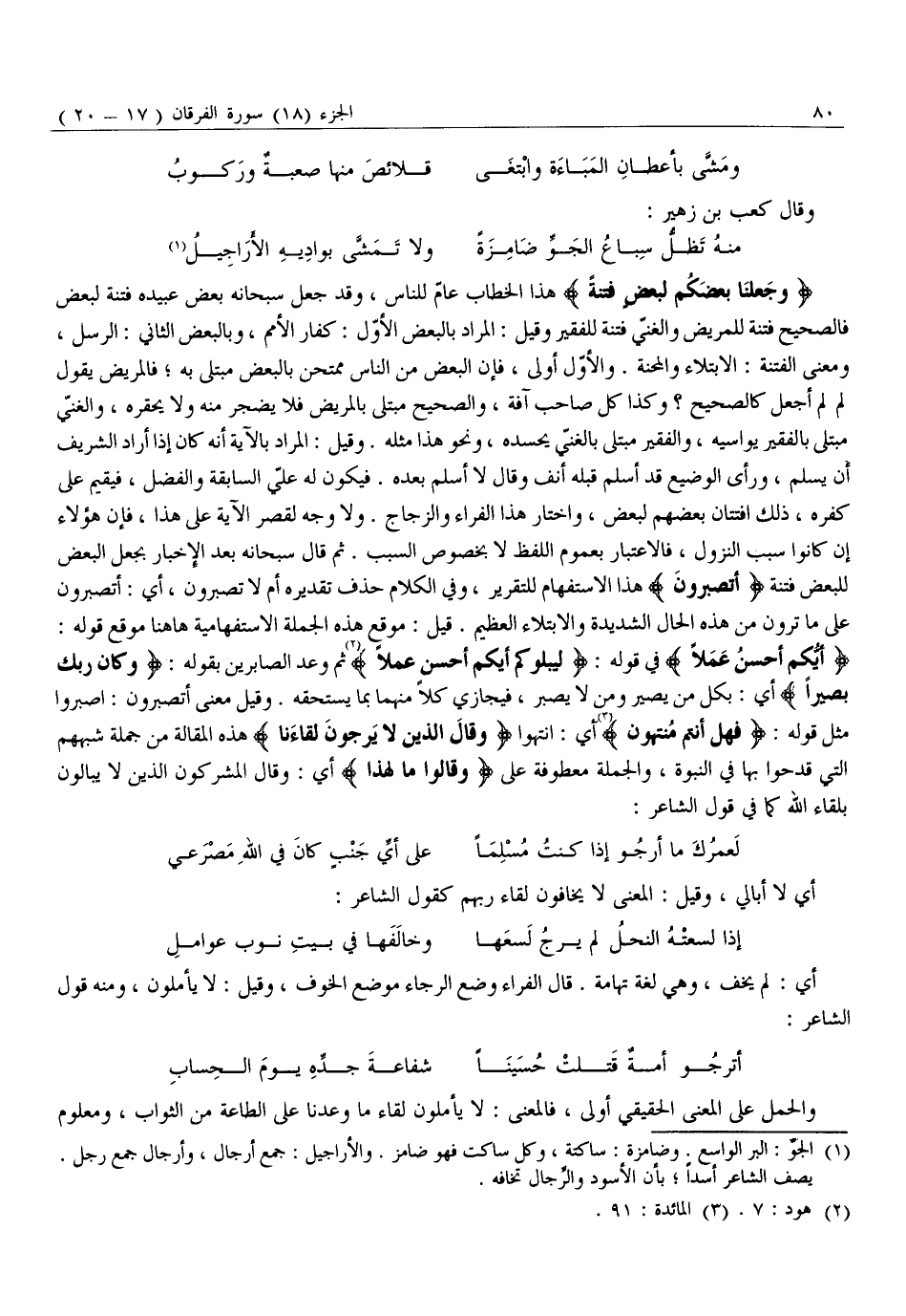 أَيُّكُمْ أَحْسَنُ عَمَلًا فِي قَوْلِهِ: لِيَبْلُوَكُمْ أَيُّكُمْ أَحْسَنُ عَمَلًا «2» ثُمَّ وَعَدَ الصَّابِرِينَ بِقَوْلِهِ: وَكانَ رَبُّكَ بَصِيراً أي: بكل من يصير وَمَنْ لَا يَصْبِرُ، فَيُجَازِي كُلًّا مِنْهُمَا بِمَا يَسْتَحِقُّهُ. وَقِيلَ مَعْنَى أَتَصْبِرُونَ: اصْبِرُوا مِثْلُ قَوْلِهِ: فَهَلْ أَنْتُمْ مُنْتَهُونَ «3» أَيِ: انْتَهُوا وَقالَ الَّذِينَ لَا يَرْجُونَ لِقاءَنا هَذِهِ الْمَقَالَةُ مِنْ جُمْلَةِ شُبَهِهِمُ الَّتِي قَدَحُوا بِهَا فِي النُّبُوَّةِ، وَالْجُمْلَةُ معطوفة على وَقالُوا ما لِهذَا أَيْ: وَقَالَ الْمُشْرِكُونَ الَّذِينَ لَا يُبَالُونَ بِلِقَاءِ اللَّهِ كَمَا فِي قَوْلِ الشَّاعِرِ: