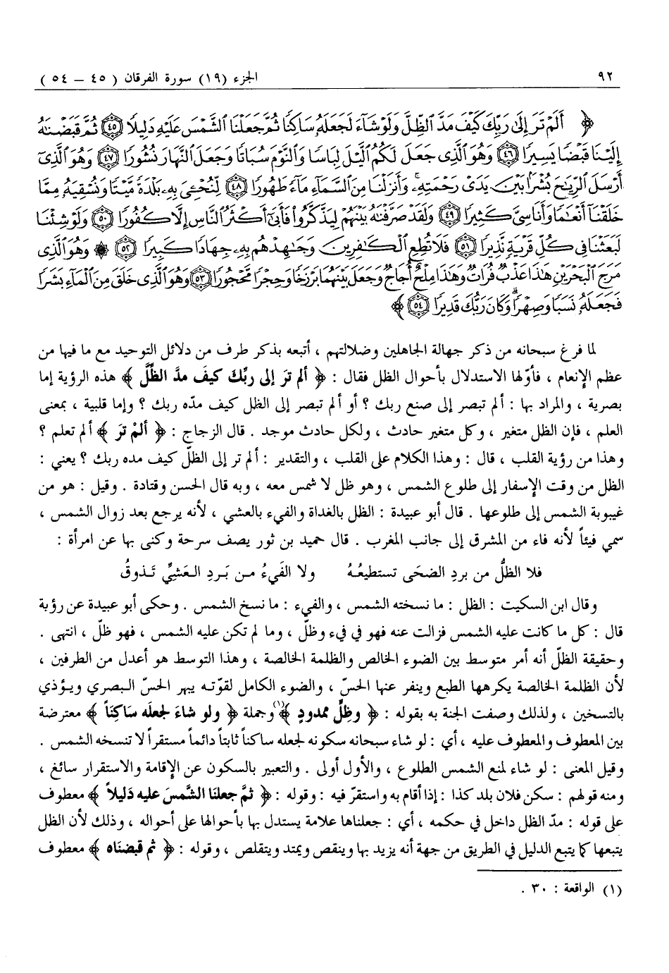 أَلَمْ تَرَ إِلى رَبِّكَ كَيْفَ مَدَّ الظِّلَّ وَلَوْ شاءَ لَجَعَلَهُ ساكِناً ثُمَّ جَعَلْنَا الشَّمْسَ عَلَيْهِ دَلِيلاً (45) ثُمَّ قَبَضْناهُ إِلَيْنا قَبْضاً يَسِيراً (46) وَهُوَ الَّذِي جَعَلَ لَكُمُ اللَّيْلَ لِباساً وَالنَّوْمَ سُباتاً وَجَعَلَ النَّهارَ نُشُوراً (47) وَهُوَ الَّذِي أَرْسَلَ الرِّياحَ بُشْراً بَيْنَ يَدَيْ رَحْمَتِهِ وَأَنْزَلْنا مِنَ السَّماءِ مَاءً طَهُوراً (48) لِنُحْيِيَ بِهِ بَلْدَةً مَيْتاً وَنُسْقِيَهُ مِمَّا خَلَقْنا أَنْعاماً وَأَناسِيَّ كَثِيراً (49)