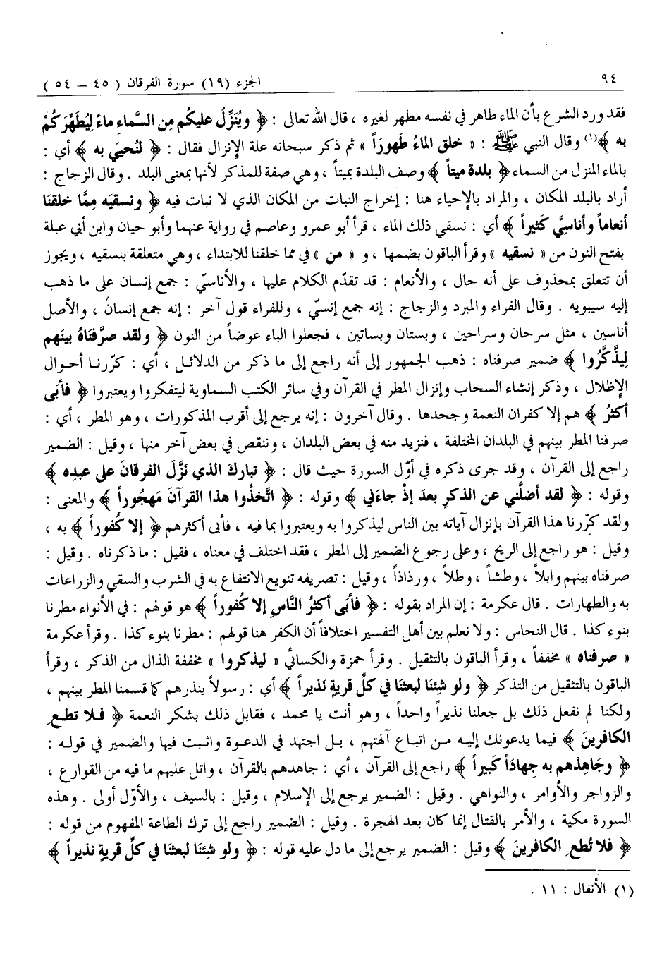 أَرَادَ بِالْبَلَدِ الْمَكَانَ، وَالْمُرَادُ بِالْإِحْيَاءِ هُنَا: إِخْرَاجُ النَّبَاتِ مِنَ الْمَكَانِ الَّذِي لَا نَبَاتَ فِيهِ وَنُسْقِيَهُ مِمَّا خَلَقْنا أَنْعاماً وَأَناسِيَّ كَثِيراً أَيْ: نُسَقِي ذَلِكَ الْمَاءَ، قَرَأَ أَبُو عَمْرٍو وَعَاصِمٌ فِي رِوَايَةٍ عَنْهُمَا وَأَبُو حَيَّانَ وَابْنُ أَبِي عَبْلَةَ بِفَتْحِ النُّونِ مِنْ «نَسْقِيهِ» وَقَرَأَ الْبَاقُونَ بِضَمِّهَا، وَ «مِنْ» فِي مِمَّا خَلَقْنَا لِلِابْتِدَاءِ، وَهِيَ مُتَعَلِّقَةٌ بِنُسْقِيهِ، وَيَجُوزُ أَنْ تَتَعَلَّقَ بِمَحْذُوفٍ عَلَى أَنَّهُ حَالٌ، وَالْأَنْعَامُ: قَدْ تَقَدَّمَ الْكَلَامُ عَلَيْهَا، وَالْأَنَاسِيُّ: جَمْعُ إِنْسَانٍ عَلَى مَا ذَهَبَ إِلَيْهِ سِيبَوَيْهِ. وَقَالَ الْفَرَّاءُ وَالْمُبَرِّدُ وَالزَّجَّاجُ: إِنَّهُ جَمْعُ إِنْسِيٍّ، وَلِلْفَرَّاءِ قَوْلٌ آخَرُ: إِنَّهُ جَمْعُ إِنْسَانٍ، وَالْأَصْلُ أَنَاسِينَ، مِثْلُ سَرْحَانَ وَسَرَاحِينَ، وَبُسْتَانٍ وَبَسَاتِينَ، فَجَعَلُوا الْبَاءَ عِوَضًا مِنَ النُّونِ وَلَقَدْ صَرَّفْناهُ بَيْنَهُمْ لِيَذَّكَّرُوا ضَمِيرُ صَرَّفْنَاهُ: ذَهَبَ الْجُمْهُورُ إِلَى أَنَّهُ رَاجِعٌ إِلَى مَا ذُكِرَ مِنَ الدَّلَائِلِ، أَيْ: كَرَّرْنَا أَحْوَالَ الْإِظْلَالِ، وَذِكْرُ إِنْشَاءِ السَّحَابِ وَإِنْزَالِ الْمَطَرِ فِي الْقُرْآنِ وَفِي سَائِرِ الْكُتُبِ السَّمَاوِيَّةِ لِيَتَفَكَّرُوا ويعتبروا فَأَبى أَكْثَرُ هُمْ إِلَّا كُفْرَانَ النِّعْمَةِ وَجَحْدَهَا. وَقَالَ آخَرُونَ: إِنَّهُ يَرْجِعُ إِلَى أَقْرَبِ الْمَذْكُورَاتِ، وَهُوَ الْمَطَرُ، أَيْ: