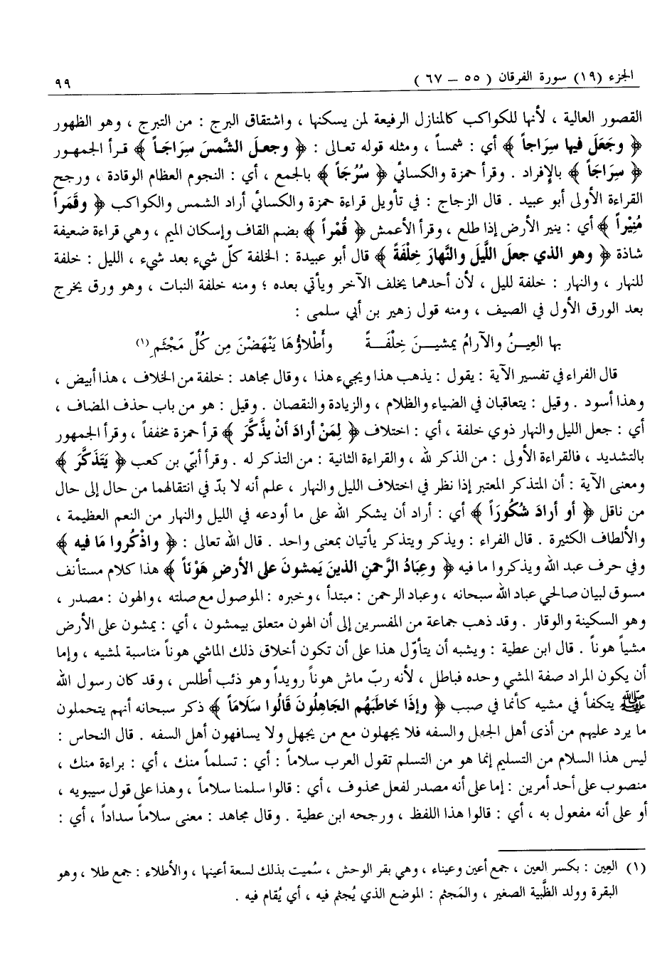 قَالَ الْفَرَّاءُ فِي تَفْسِيرِ الْآيَةِ: يَقُولُ: يَذْهَبُ هَذَا وَيَجِيءُ هَذَا، وَقَالَ مُجَاهِدٌ: خِلْفَةٌ مِنَ الْخِلَافِ، هَذَا أَبْيَضُ، وَهَذَا أَسْوَدُ. وَقِيلَ: يَتَعَاقَبَانِ فِي الضِّيَاءِ وَالظَّلَامِ، وَالزِّيَادَةِ وَالنُّقْصَانِ. وَقِيلَ: هُوَ مِنْ بَابِ حَذْفِ الْمُضَافِ، أَيْ: جَعَلَ اللَّيْلَ وَالنَّهَارَ ذَوِي خِلْفَةٍ، أَيِ: اخْتِلَافٍ لِمَنْ أَرادَ أَنْ يَذَّكَّرَ قرأ حَمْزَةُ مُخَفَّفًا، وَقَرَأَ الْجُمْهُورُ بِالتَّشْدِيدِ، فَالْقِرَاءَةُ الْأُولَى: مِنَ الذِّكْرِ لِلَّهِ، وَالْقِرَاءَةُ الثَّانِيَةُ: مِنَ التَّذَكُّرِ لَهُ. وَقَرَأَ أُبَيُّ بْنُ كَعْبٍ «يَتَذَكَّرُ» وَمَعْنَى الْآيَةِ: أَنَّ الْمُتَذَكِّرَ الْمُعْتَبِرَ إِذَا نَظَرَ فِي اخْتِلَافِ اللَّيْلِ وَالنَّهَارِ، عَلِمَ أَنَّهُ لَا بُدَّ فِي انْتِقَالِهِمَا مِنْ حَالٍ إِلَى حَالٍ مِنْ نَاقِلٍ أَوْ أَرادَ شُكُوراً أَيْ: أَرَادَ أَنْ يَشْكُرَ اللَّهَ عَلَى مَا أَوْدَعَهُ فِي اللَّيْلِ وَالنَّهَارِ مِنَ النِّعَمِ الْعَظِيمَةِ، وَالْأَلْطَافِ الْكَثِيرَةِ. قَالَ الْفَرَّاءُ: وَيُذَكِّرُ وَيَتَذَكَّرُ يَأْتِيَانِ بِمَعْنًى وَاحِدٍ. قَالَ الله تعالى: وَاذْكُرُوا ما فِيهِ وَفِي حَرْفِ عَبْدِ اللَّهِ وَيَذْكُرُوا مَا فِيهِ وَعِبادُ الرَّحْمنِ الَّذِينَ يَمْشُونَ عَلَى الْأَرْضِ هَوْناً هَذَا كَلَامٌ مُسْتَأْنَفٌ مَسُوقٌ لِبَيَانِ صَالِحِي عِبَادِ اللَّهِ سُبْحَانَهُ، وَعِبَادُ الرَّحْمَنِ: مُبْتَدَأٌ، وَخَبَرُهُ: الْمَوْصُولُ مَعَ صِلَتِهِ، وَالْهَوْنُ: مَصْدَرٌ، وَهُوَ السَّكِينَةُ وَالْوَقَارُ. وَقَدْ ذَهَبَ جَمَاعَةٌ مِنَ الْمُفَسِّرِينَ إِلَى أَنَّ الْهَوْنَ مُتَعَلِّقٌ بِيَمْشُونَ، أَيْ: يَمْشُونَ عَلَى الْأَرْضِ مَشْيًا هَوْنًا. قَالَ ابْنُ عَطِيَّةَ: وَيُشْبِهُ أَنْ يَتَأَوَّلَ هَذَا عَلَى أَنْ تَكُونَ أَخْلَاقُ ذَلِكَ الْمَاشِي هَوْنًا مُنَاسِبَةً لِمَشْيِهِ، وَأَمَّا أَنْ يَكُونَ الْمُرَادُ صِفَةُ الْمَشْيِ وَحْدُهُ فَبَاطِلٌ، لِأَنَّهُ رُبَّ مَاشٍ هَوْنًا رُوَيْدًا وَهُوَ ذِئْبٌ أَطْلَسُ، وَقَدْ كَانَ رَسُولُ اللَّهِ صَلَّى اللَّهُ عَلَيْهِ وَسَلَّمَ يتكفأ في مشيه كأنما فِي صَبَبٍ وَإِذا خاطَبَهُمُ الْجاهِلُونَ قالُوا سَلاماً ذَكَرَ سُبْحَانَهُ أَنَّهُمْ يَتَحَمَّلُونَ مَا يَرِدُ عَلَيْهِمْ مِنْ أَذَى أَهْلِ الْجَهْلِ وَالسَّفَهِ فَلَا يَجْهَلُونَ مَعَ مَنْ يَجْهَلُ وَلَا يُسَافِهُونَ أَهْلَ السَّفَهِ. قَالَ النَّحَّاسُ: