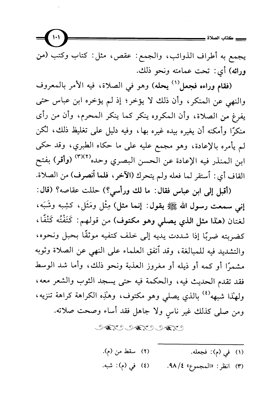 (أقبل إلى ابن عباس فقال: ما لك ورأسي؟ ) حللت عقاصه؟ (قال: إني سمعت رسول الله -صلى الله عليه وسلم- يقول: إنما مثل) مِثْل ومَثَل، كشِبه وشَبَه، لغتان (هذا مثل الذي يصلي وهو مكتوف) من قولهم: كَتَفْتُه كَتْفًا، كضربته ضربًا إذا شددت يديه إلى خلف كتفيه موثقًا بحبل ونحوه، والتشديد فيه للمبالغة، وقد اتفق العلماء على النهي عن الصلاة وثوبه مشمرًا أو كمه أو ذيله أو مغروز العذبة ونحو ذلك، وأما شد الوسط فقد تقدم الحديث فيه، والحكمة فيه حتى يسجد الثوب والشعر معه، ولهذا شبهه (¬4) بالذي يصلي وهو مكتوف، وهذِه الكراهة كراهة تنزيه، ومن صلى كذلك غير ناسٍ ولا جاهل فقد أساء وصحت صلاته.