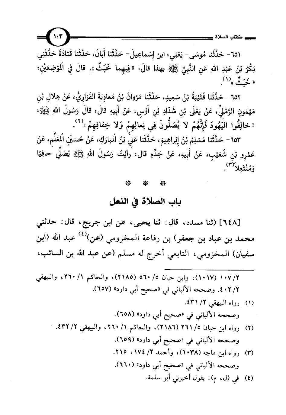 653 - حَدَّثَنا مسْلِم بْن إِبْراهِيمَ، حَدَّثَنا عَلِيُّ بْن المُبارَكِ، عَنْ حُسَيْنٍ المُعَلِّمِ، عَنْ عَمْرِو بْنِ شعَيْب، عَنْ أَبِيهِ، عَنْ جَدِّهِ قال: رأيْتُ رَسولَ اللهِ -صلى الله عليه وسلم- يُصَلّي حافِيًا وَمُنْتَعِلًا (¬3).