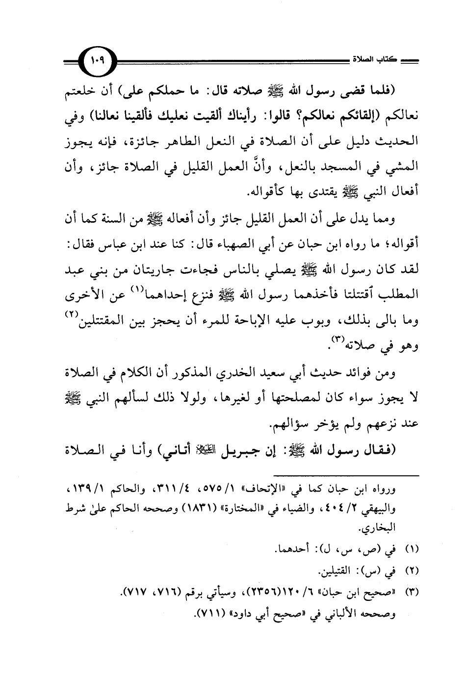 ومما يدل على أن العمل القليل جائز وأن أفعاله -صلى الله عليه وسلم- من السنة كما أن أقواله، ما رواه ابن حبان عن أبي الصهباء قال: كنا عند ابن عباس فقال: لقد كان رسول الله -صلى الله عليه وسلم- يصلي بالناس فجاءت جاريتان من بني عبد المطلب اقتتلتا فأخذهما رسول الله -صلى الله عليه وسلم- فنزع إحداهما (¬1) عن الأخرى وما بالى بذلك، وبوب عليه الإباحة للمرء أن يحجز بين المقتتلين (¬2) وهو في صلاته (¬3).