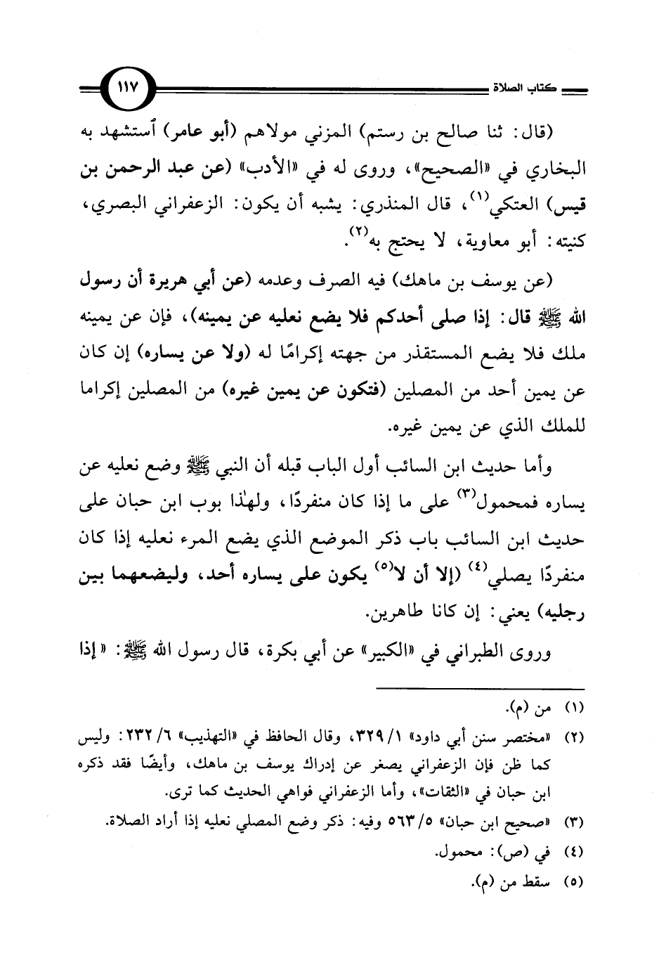(¬3) "صحيح ابن حبان" 5/ 563 وفيه: ذكر وضع المصلي نعليه إذا أراد الصلاة.