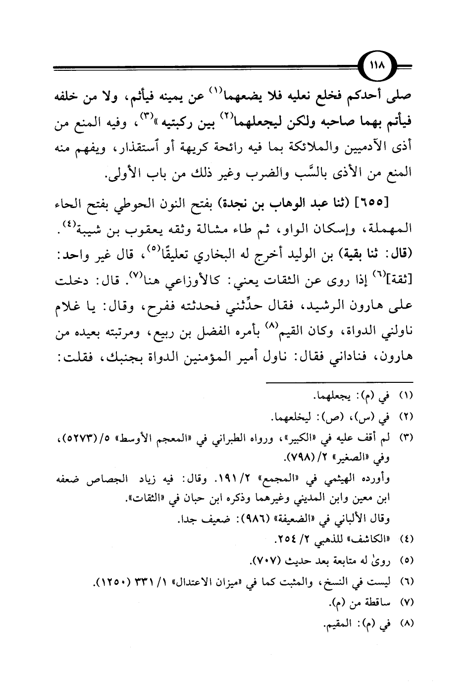 [655] (ثنا عبد الوهاب بن نجدة) بفتح النون الحوطي بفتح الحاء المهملة، وإسكان الواو، ثم طاء مشالة وثقه يعقوب بن شيبة (¬4). (قال: ثنا بقية) بن الوليد أخرج له البخاري تعليقًا (¬5)، قال غير واحد: [ثقة] (¬6) إذا روى عن الثقات يعني: كالأوزاعي هنا (¬7). قال: دخلت على هارون الرشيد، فقال حدّثني فحدثته ففرح، وقال: يا غلام ناولني الدواة، وكان القيم (¬8) بأمره الفضل بن ربيع، ومرتبته بعيده من هارون، فناداني فقال: ناول أمير المؤمنين الدواة بجنبك، فقلت: