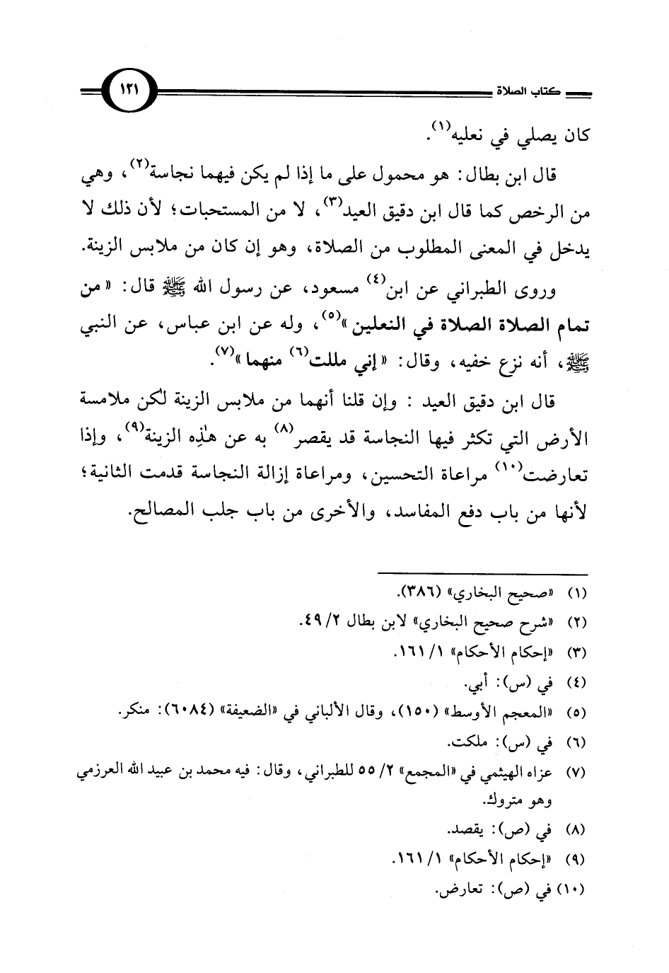 وروى الطبراني عن ابن (¬4) مسعود، عن رسول الله -صلى الله عليه وسلم- قال: "من تمام الصلاة الصلاة في النعلين" (¬5)، وله عن ابن عباس، عن النبي -صلى الله عليه وسلم-، أنه نزع خفيه، وقال: "إني مللت (¬6) منهما" (¬7).