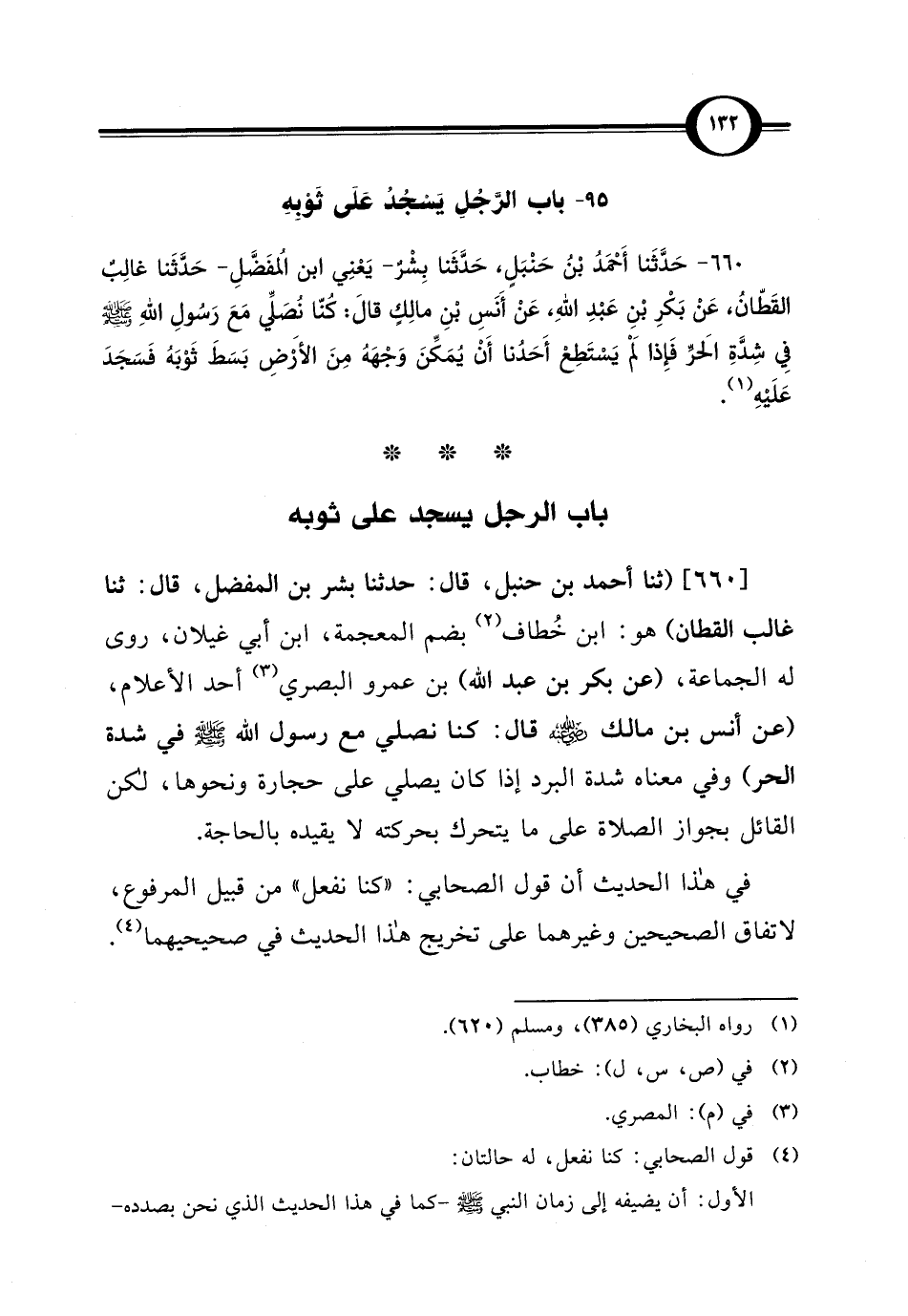 660 - حَدَّثَنا أَحْمَدُ بْنُ حَنْبَل، حَدَّثَنا بِشْرٌ -يَعْنِي ابن المُفَضَّلِ- حَدَّثَنا غالِبٌ القَطّان، عَنْ بَكْرِ بْنِ عَبدِ اللهِ، عَنْ أَنَسِ بْنِ مالِكٍ قال: كنّا نُصِلِّي مَعَ رَسُولِ اللهِ -صلى الله عليه وسلم- فِي شِدَّةِ الحرِّ فَإذا لَمْ يَسْتَطِعْ أَحَدُنا أَنْ يُمَكِّنَ وَجْهَهُ مِنَ الأرْضِ بَسَطَ ثَوْبَهُ فَسَجَدَ عَلَيْهِ (¬1).