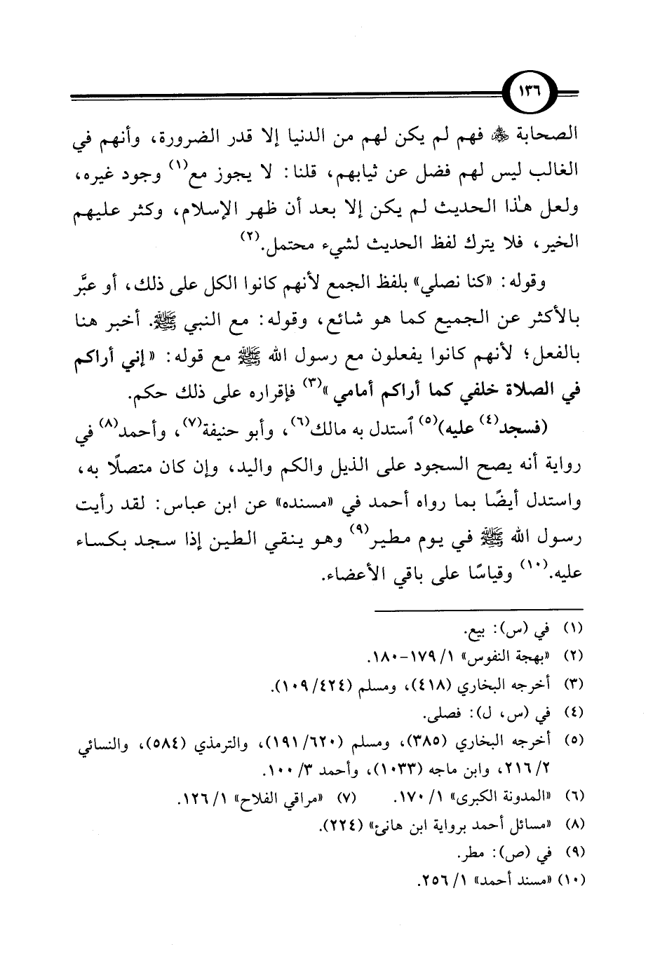 الصحابة -رضي الله عنهم- فهم لم يكن لهم من الدنيا إلا قدر الضرورة، وأنهم في الغالب ليس لهم فضل عن ثيابهم، قلنا: لا يجوز مع (¬1) وجود غيره، ولعل هذا الحديث لم يكن إلا بعد أن ظهر الإسلام، وكثر عليهم الخير، فلا يترك لفظ الحديث لشيء محتمل. (¬2)