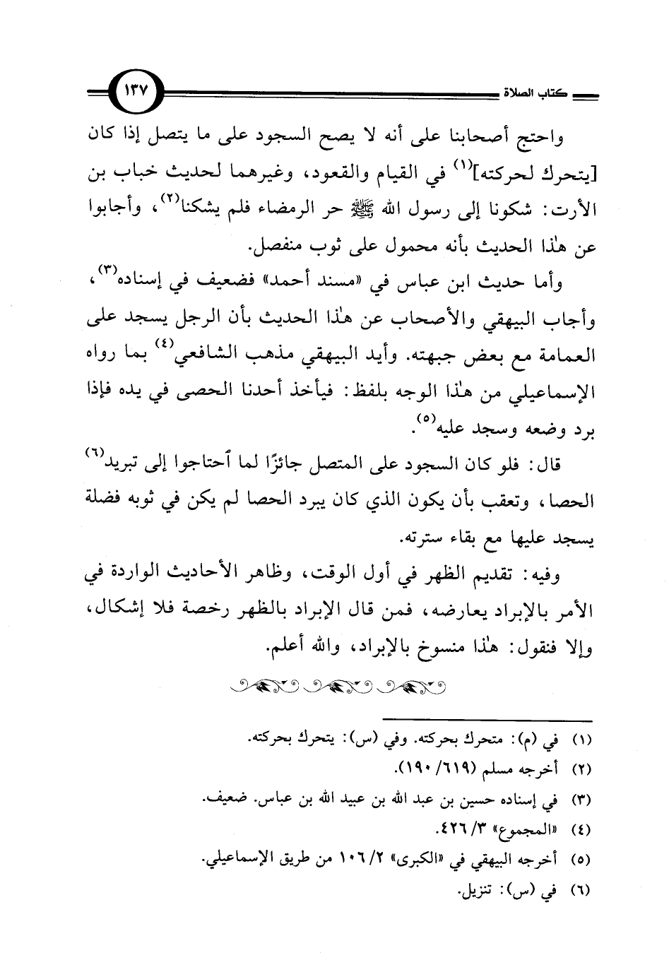 وأما حديث ابن عباس في "مسند أحمد" فضعيف في إسناده (¬3)، وأجاب البيهقي والأصحاب عن هذا الحديث بأن الرجل يسجد على العمامة مع بعض جبهته. وأيد البيهقي مذهب الشافعي (¬4) بما رواه الإسماعيلي من هذا الوجه بلفظ: فيأخذ أحدنا الحصى في يده فإذا برد وضعه وسجد عليه (¬5).