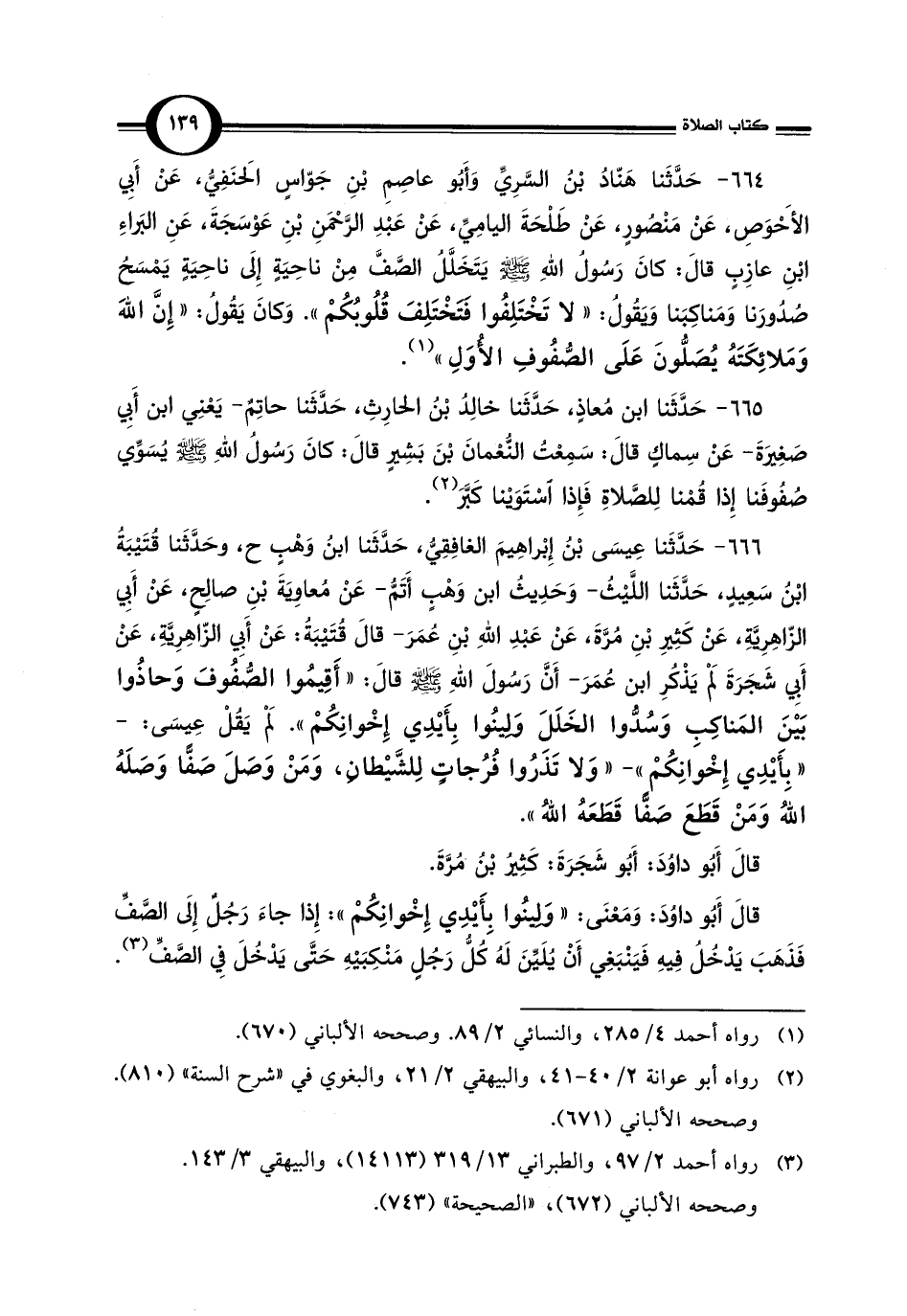 664 - حَدَّثَنا هَنّادُ بْن السَّرِيِّ وَأَبُو عاصِمِ بْنِ جَوّاسٍ الحَنَفِيُّ، عَنْ أَبِي الأحوَصِ، عَنْ مَنْصورٍ، عَنْ طَلْحَةَ اليامِيِّ، عَنْ عَبْدِ الرَّحْمَنِ بْنِ عَوْسَجَةَ، عَنِ البَراءِ بْنِ عازِبٍ قال: كانَ رَسُول اللهِ -صلى الله عليه وسلم- يَتَخَلَّل الصَّفَّ مِنْ ناحِيَةٍ إِلَى ناحِيَةٍ يَمْسَحُ صُدُورَنا وَمَناكِبَنا وَيَقُولُ: "لا تَخْتَلِفُوا فَتَخْتَلِفَ قُلُوُبكُمْ". وَكانَ يَقُول: "إِنَّ اللهَ وَمَلائِكَتَهُ يُصَلُّونَ عَلَى الصُّفُوفِ الأُوَلِ" (¬1).