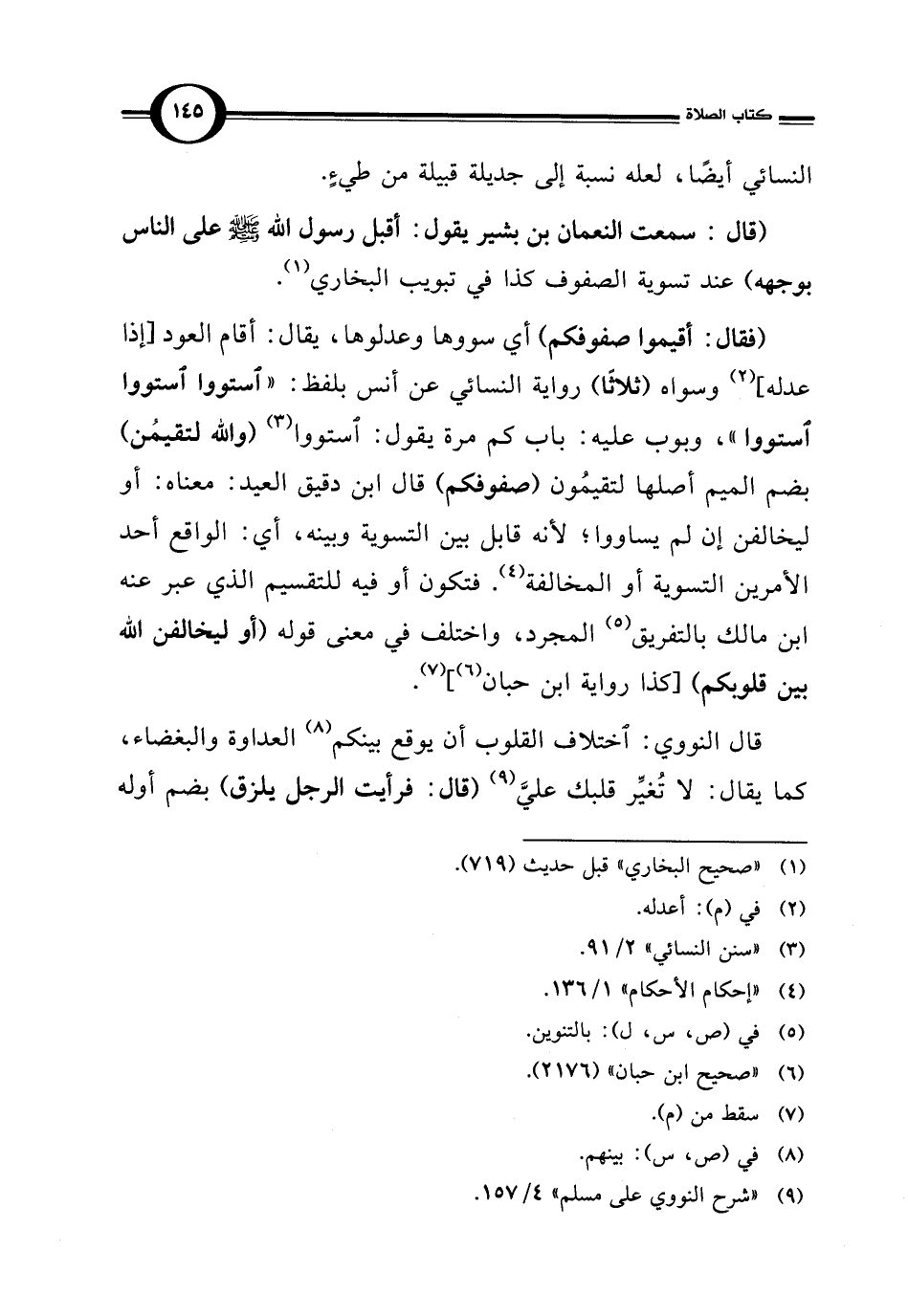 (قال: سمعت النعمان بن بشير يقول: أقبل رسول الله -صلى الله عليه وسلم- على الناس بوجهه) عند تسوية الصفوف كذا في تبويب البخاري (¬1).