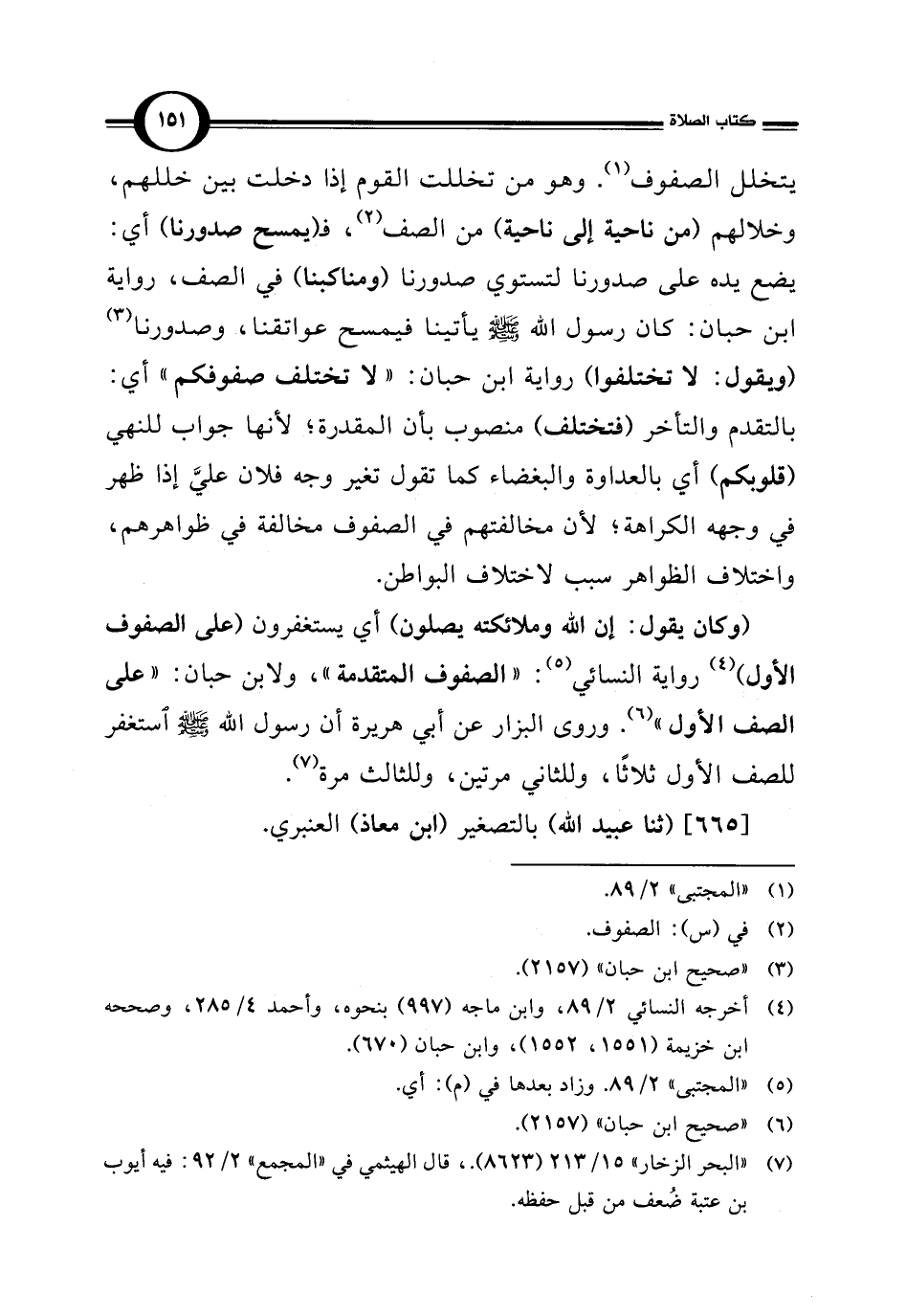 يتخلل الصفوف (¬1). وهو من تخللت القوم إذا دخلت بين خللهم، وخلالهم (من ناحية إلى ناحية) من الصف (¬2)، فـ (يمسح صدورنا) أي: يضع يده على صدورنا لتستوي صدورنا (ومناكبنا) في الصف، رواية ابن حبان: كان رسول الله -صلى الله عليه وسلم- يأتينا فيمسح عواتقنا، وصدورنا (¬3) (ويقول: لا تختلفوا) رواية ابن حبان: "لا تختلف صفوفكم" أي: بالتقدم والتأخر (فتختلف) منصوب بأن المقدرة؛ لأنها جواب للنهي (قلوبكم) أي بالعداوة والبغضاء كما تقول تغير وجه فلان عليَّ إذا ظهر في وجهه الكراهة؛ لأن مخالفتهم في الصفوف مخالفة في ظواهرهم، واختلاف الظواهر سبب لاختلاف البواطن.