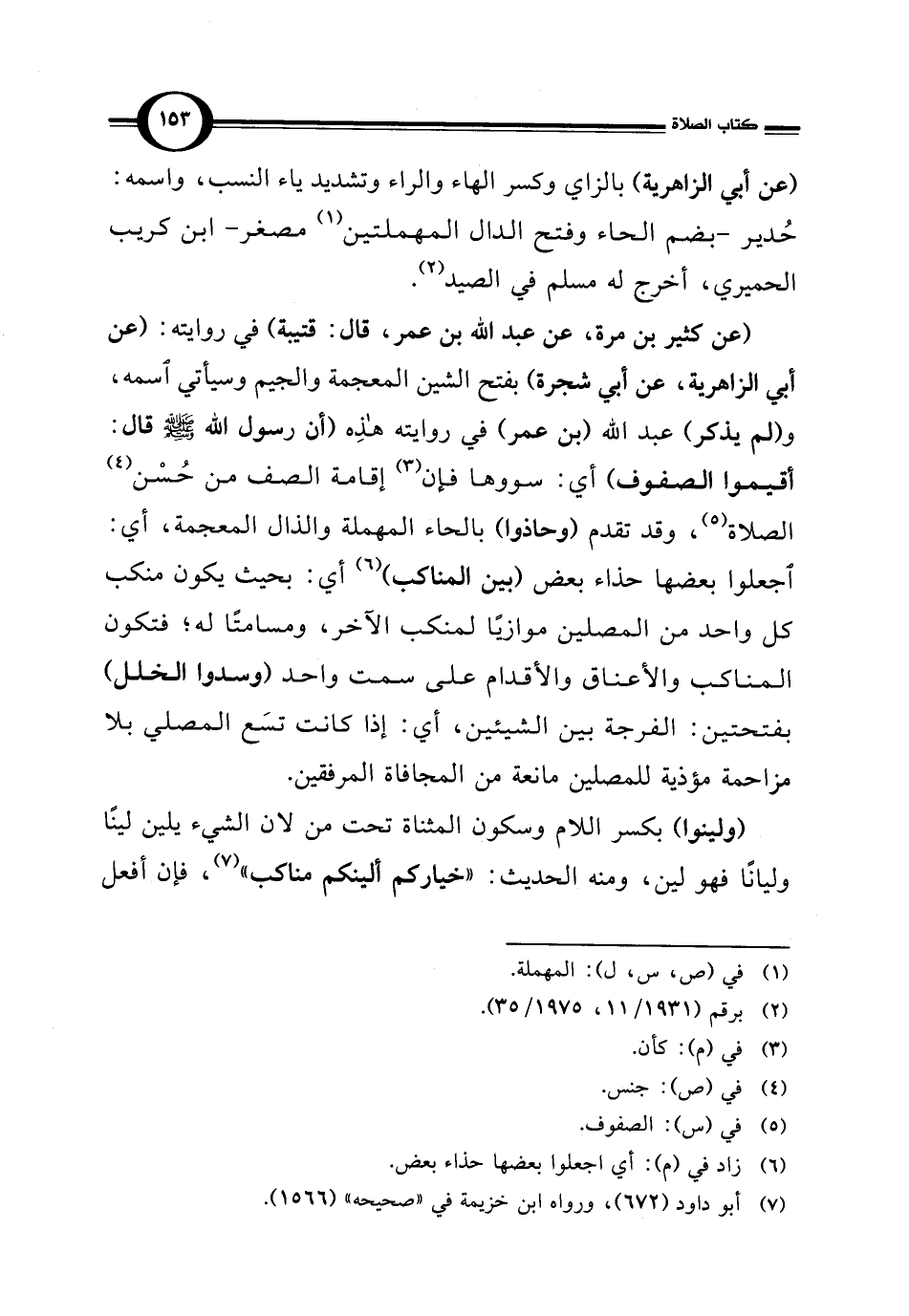 (عن كثير بن مرة، عن عبد الله بن عمر، قال: قتيبة) في روايته: (عن أبي الزاهرية، عن أبي شجرة) بفتح الشين المعجمة والجيم وسيأتي اسمه، و (لم يذكر) عبد الله (بن عمر) في روايته هذِه (أن رسول الله -صلى الله عليه وسلم- قال: أقيموا الصفوف) أي: سووها فإن (¬3) إقامة الصف من حُسْن (¬4) الصلاة (¬5)، وقد تقدم (وحاذوا) بالحاء المهملة والذال المعجمة، أي: اجعلوا بعضها حذاء بعض (بين المناكب) (¬6) أي: بحيث يكون منكب كل واحد من المصلين موازيًا لمنكب الآخر، ومسامتًا له؛ فتكون المناكب والأعناق والأقدام على سمت واحد (وسدوا الخلل) بفتحتين: الفرجة بين الشيئين، أي: إذا كانت تسَع المصلي بلا مزاحمة مؤذية للمصلين مانعة من المجافاة المرفقين.