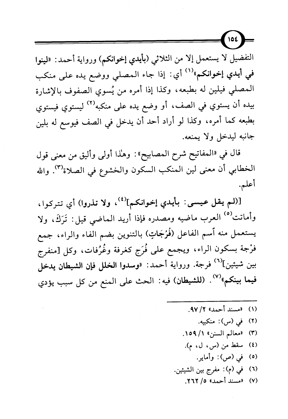 التفضيل لا يستعمل إلا من الثلاثي (بأيدي إخوانكم) ورواية أحمد: "لينوا في أيدي إخوانكم" (¬1) أي: إذا جاء المصلي ووضع يده على منكب المصلي فيلين له بطبعه، وكذا إذا أمره من يُسوي الصفوف بالإشارة بيده أن يستوي في الصف، أو وضع يده على منكبه (¬2) ليستوي فيستوي بطبعه كما أمره، وكذا لو أراد أحد أن يدخل في الصف فيوسع له بلين جانبه ليدخل ولا يمنعه.