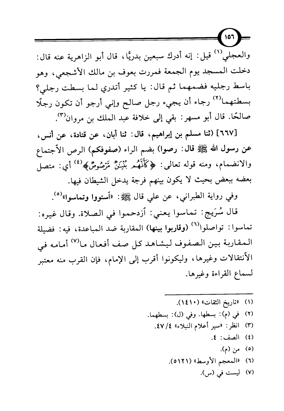 [667] (ثنا مسلم بن إبراهيم، قال: ثنا أبان، عن قتادة، عن أنس، عن رسول الله -صلى الله عليه وسلم- قال: رصوا) بضم الراء (صفوفكم) الرص الاجتماع والانضمام، ومنه قوله تعالى: {كَأَنَّهُمْ بُنْيَانٌ مَرْصُوصٌ} (¬4) أي: متصل بعضه ببعض بحيث لا يكون بينهم فرجة يدخل الشيطان فيها.