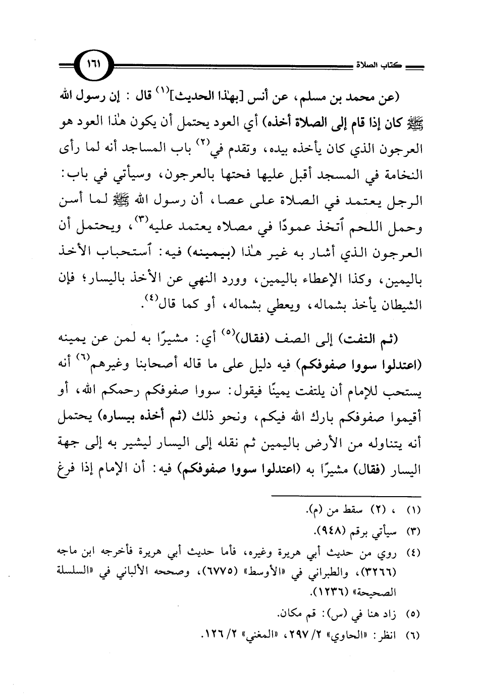 (ثم التفت) إلى الصف (فقال) (¬5) أي: مشيرًا به لمن عن يمينه (اعتدلوا سووا صفوفكم) فيه دليل على ما قاله أصحابنا وغيرهم (¬6) أنه يستحب للإمام أن يلتفت يمينًا فيقول: سووا صفوفكم رحمكم الله، أو أقيموا صفوفكم بارك الله فيكم، ونحو ذلك (ثم أخذه بيساره) يحتمل أنه يتناوله من الأرض باليمين ثم نقله إلى اليسار ليشير به إلى جهة اليسار (فقال) مشيرًا به (اعتدلوا سووا صفوفكم) فيه: أن الإمام إذا فرغ