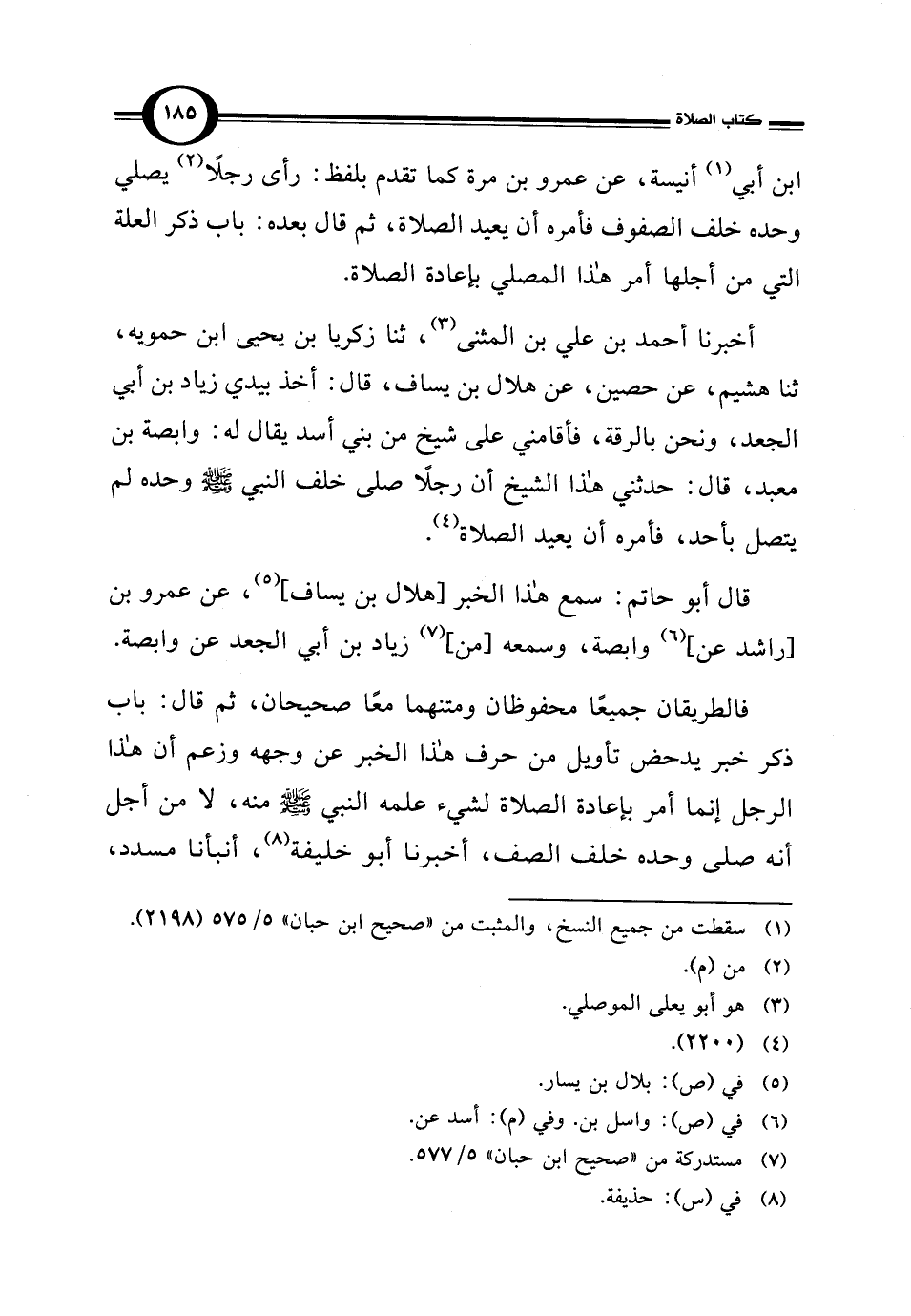 ابن أبي (¬1) أنيسة، عن عمرو بن مرة كما تقدم بلفظ: رأى رجلًا (¬2) يصلي وحده خلف الصفوف فأمره أن يعيد الصلاة، ثم قال بعده: باب ذكر العلة التي من أجلها أمر هذا المصلي بإعادة الصلاة.