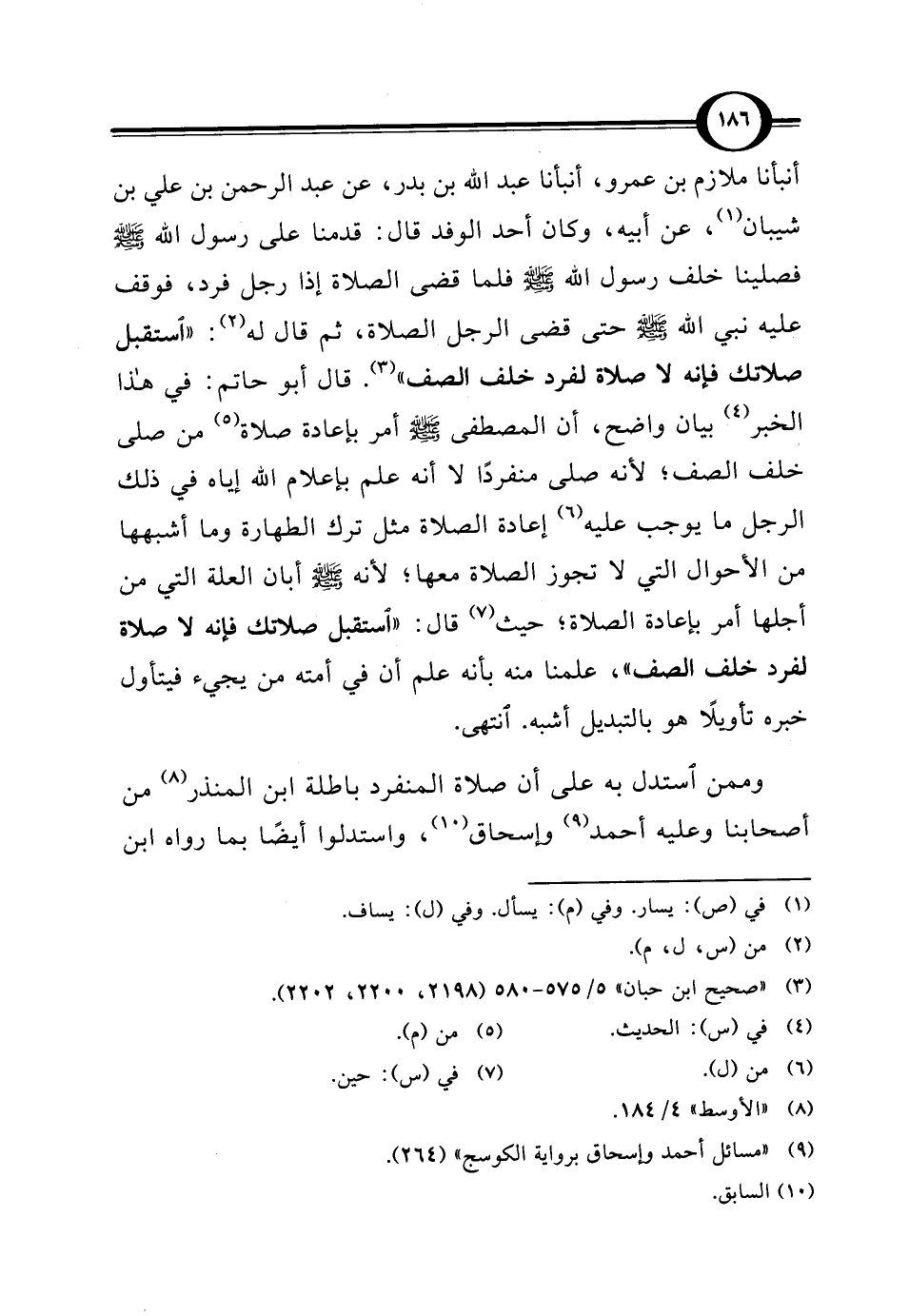أنبأنا ملازم بن عمرو، أنبأنا عبد الله بن بدر، عن عبد الرحمن بن علي بن شيبان (¬1)، عن أبيه، وكان أحد الوفد قال: قدمنا على رسول الله -صلى الله عليه وسلم- فصلينا خلف رسول الله -صلى الله عليه وسلم- فلما قضى الصلاة إذا رجل فرد، فوقف عليه نبي الله -صلى الله عليه وسلم- حتى قضى الرجل الصلاة، ثم قال له (¬2): "استقبل صلاتك فإنه لا صلاة لفرد خلف الصف" (¬3). قال أبو حاتم: في هذا الخبر (¬4) بيان واضح، أن المصطفى -صلى الله عليه وسلم- أمر بإعادة صلاة (¬5) من صلى خلف الصف؛ لأنه صلى منفردًا لا أنه علم بإعلام الله إياه في ذلك الرجل ما يوجب عليه (¬6) إعادة الصلاة مثل ترك الطهارة وما أشبهها من الأحوال التي لا تجوز الصلاة معها؛ لأنه -صلى الله عليه وسلم- أبان العلة التي من أجلها أمر بإعادة الصلاة؛ حيث (¬7) قال: "استقبل صلاتك فإنه لا صلاة لفرد خلف الصف"، علمنا منه بأنه علم أن في أمته من يجيء فيتأول خبره تاويلًا هو بالتبديل أشبه. انتهى.