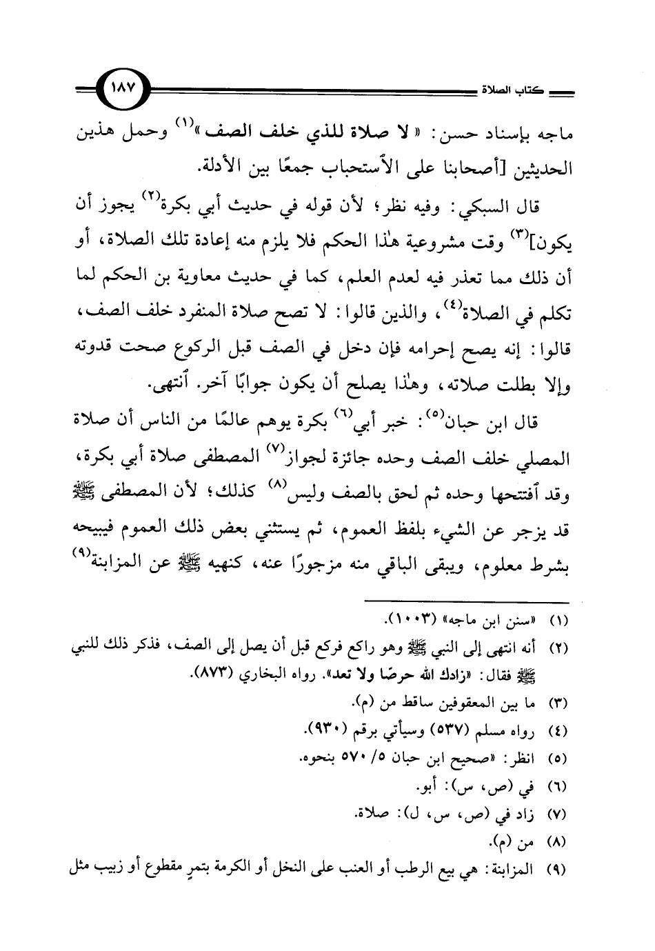 قال ابن حبان (¬5): خبر أبي (¬6) بكرة يوهم عالمًا من الناس أن صلاة المصلي خلف الصف وحده جائزة لجواز (¬7) المصطفى صلاة أبي بكرة، وقد افتتحها وحده ثم لحق بالصف وليس (¬8) كذلك؛ لأن المصطفى -صلى الله عليه وسلم- قد يزجر عن الشيء بلفظ العموم، ثم يستثني بعض ذلك العموم فيبيحه بشرط معلوم، ويبقى الباقي منه مزجورًا عنه، كنهيه -صلى الله عليه وسلم- عن المزابنة (¬9)