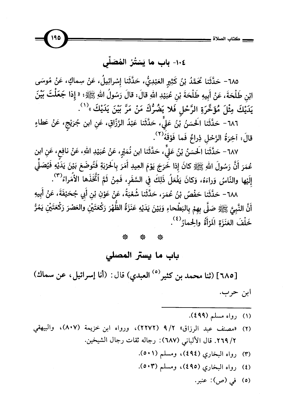 685 - حَدَّثَنا مُحَمَّدُ بْن كَثِيرٍ العَبْدِيُّ، حَدَّثَنا إِسْرائِيلُ، عَنْ سِماكٍ، عَنْ مُوسَى بْنِ طَلْحَةَ، عَنْ أَبِيهِ طَلْحَةَ بْنِ عُبَيْدِ اللهِ قال: قال رَسُول اللهِ - صلى الله عليه وسلم -: "إِذا جَعَلْتَ بَيْنَ يَدَيْكَ مِثْلَ مُؤَخَّرَةِ الرَّحْلِ فَلا يَضُرُّكَ مَنْ مَرَّ بَيْنَ يَدَيْكَ" (¬1).