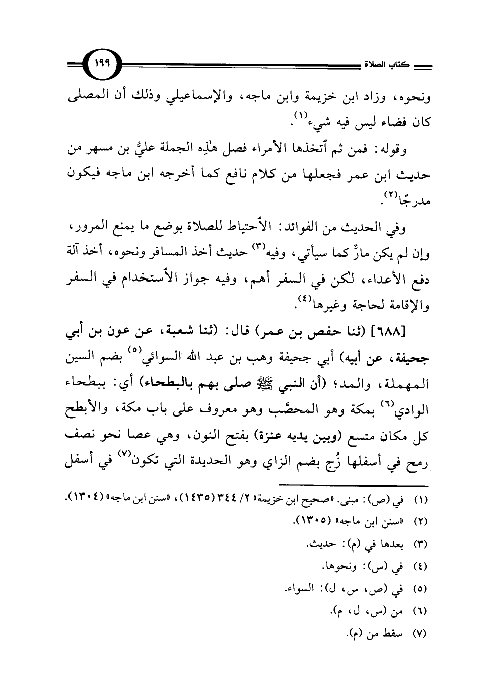 [688] (ثنا حفص بن عمر) قال: (ثنا شعبة، عن عون بن أبي جحيفة، عن أبيه) أبي جحيفة وهب بن عبد الله السوائي (¬5) بضم السين المهملة، والمد؛ (أن النبي - صلى الله عليه وسلم - صلى بهم بالبطحاء) أي: ببطحاء الوادي (¬6) بمكة وهو المحصَّب وهو معروف على باب مكة، والأبطح كل مكان متسع (وبين يديه عنزة) بفتح النون، وهي عصا نحو نصف رمح في أسفلها زُج بضم الزاي وهو الحديدة التي تكون (¬7) في أسفل
