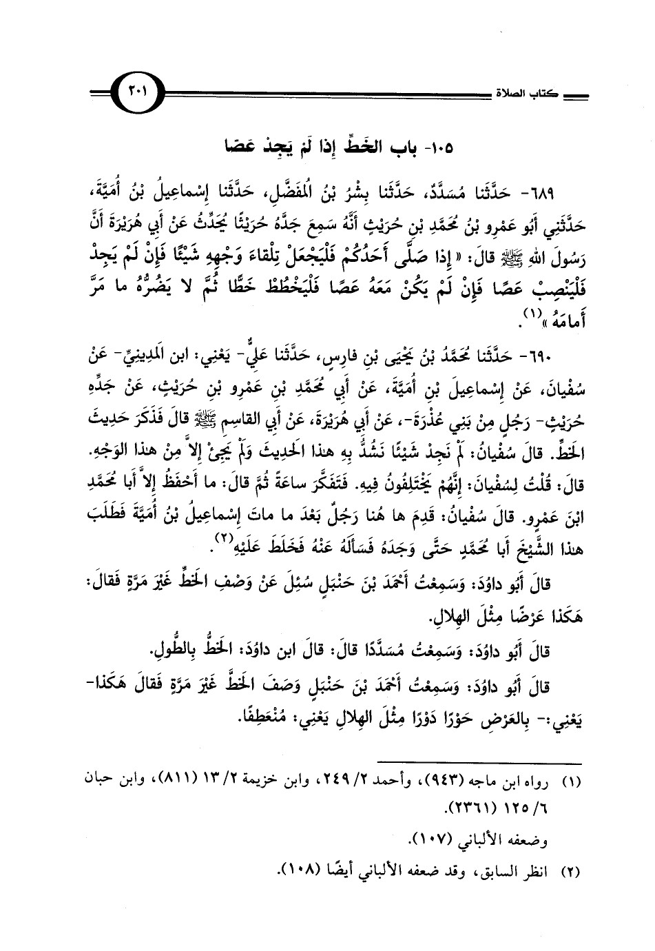 قال أَبُو داوُدَ: وَسَمِعْت أَحْمَدَ بْنَ حَنْبَلٍ سُئِلَ عَنْ وَصْفِ الخطِّ غَيْرَ مَرَّةٍ فَقال: هَكَذا عَرْضًا مِثْلَ الهِلالِ.