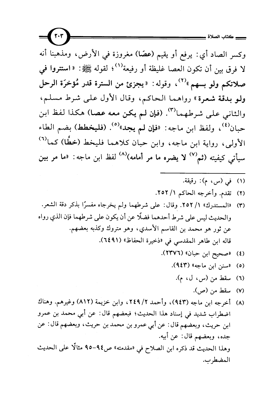 وكسر الصاد أي: يرفع أو يقيم (عصًا) مغروزة في الأرض، ومذهبنا أنه لا فرق بين أن تكون العصا غليظة أو رفيعة (¬1)؛ لقوله - صلى الله عليه وسلم -: "استتروا في صلاتكم ولو بسهم" (¬2)، وقوله: "يجزئ من السترة قدر مُؤخرَة الرحل ولو بدقة شعرة" رواهما الحاكم، وقال الأول على شرط مسلم، والثاني على شرطهما (¬3). (فإن لم يكن معه عصا) هكذا لفظ ابن حبان (¬4)، ولفظ ابن ماجه: "فإن لم يجد" (¬5). (فليخطط) بضم الطاء الأولى، رواية ابن ماجه، وابن حبان كلاهما فليخط (خطًّا) كما (¬6) سيأتي كيفيته (ثم (¬7) لا يضره ما مر أمامه) (¬8) لفظ ابن ماجه: "ما مر بين