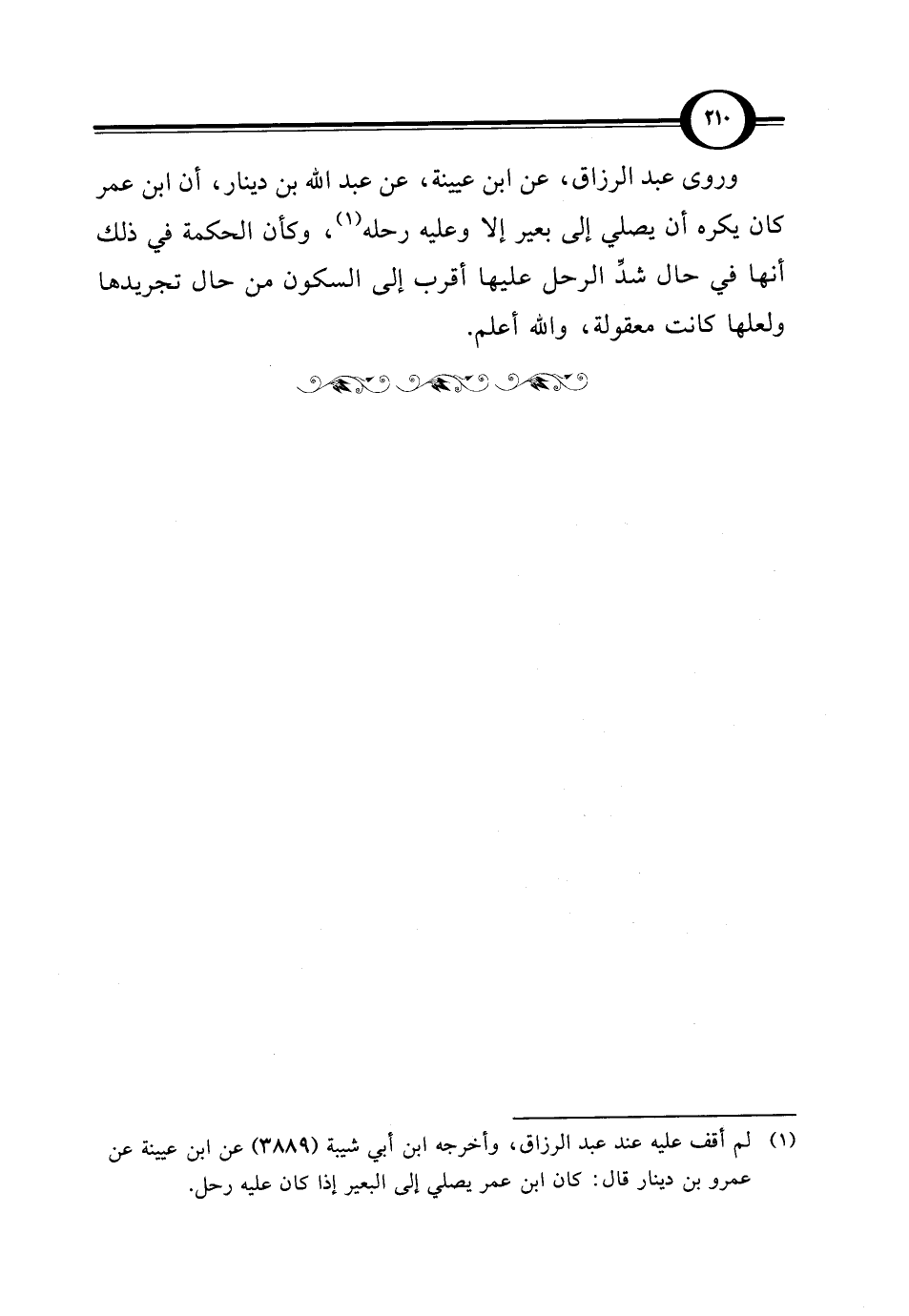 (¬1) لم أقف عليه عند عبد الرزاق، وأخرجه ابن أبي شيبة (3889) عن ابن عيينة عن عمرو بن دينار قال: كان ابن عمر يصلي إلى البعير إذا كان عليه رحل.
