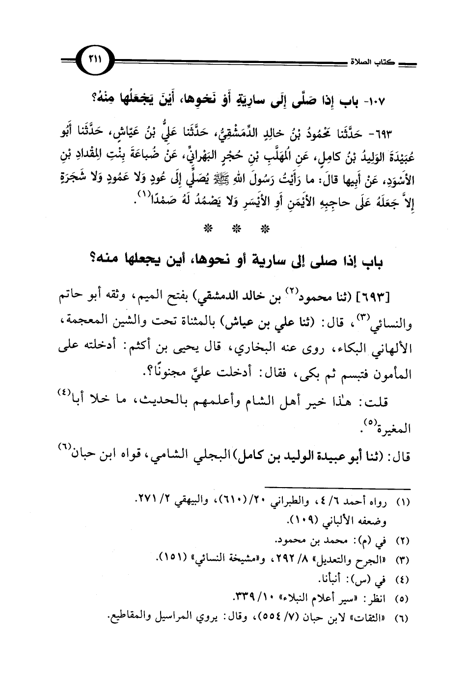 693 - حَدَّثَنا مَحْمُودُ بْنُ خالِدٍ الدِّمَشْقِيُّ، حَدَّثَنا عَلِيُّ بْنُ عَيّاشٍ، حَدَّثَنا أَبُو عُبَيْدَةَ الوَلِيدُ بْنُ كامِلٍ، عَنِ المهَلَّبِ بْنِ حُجْرٍ البَهْرانيِّ، عَنْ ضُباعَةَ بِنْتِ الِمقْدادِ بْنِ الأَسْوَدِ، عَنْ أَبِيها قال: ما رَأَيْتُ رَسُوِلَ الله - صلى الله عليه وسلم - يُصَلِّي إِلَى عُودٍ وَلا عَمُودٍ وَلا شَجَرَةٍ إِلَّا جَعَلَهُ عَلَى حاجِبِهِ الأَيْمَنِ أَوِ الأَيْسَرِ وَلا يَصْمُدُ لَهُ صَمْدًا (¬1).